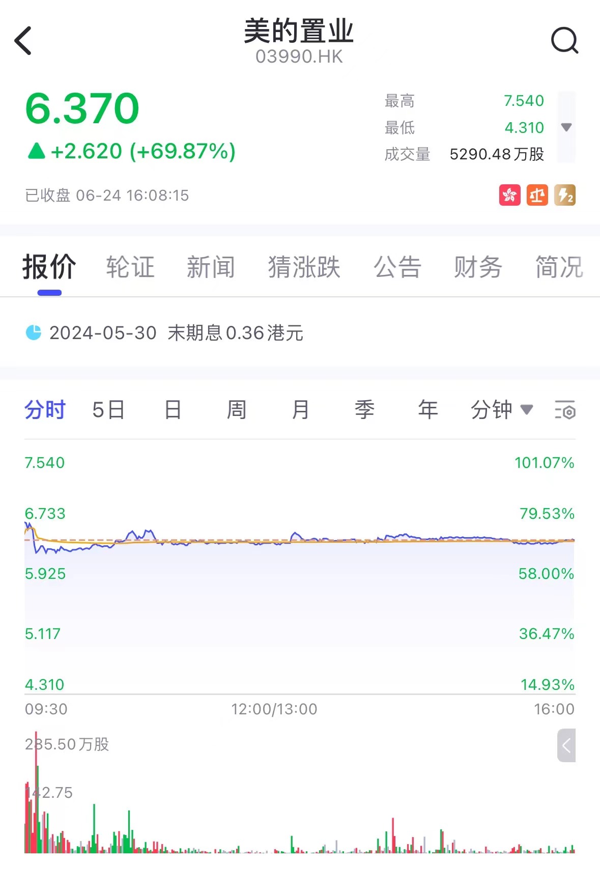6月24日早間開盤,港股三大指數低開,其中恒生指數(80000.HK)跌破18000點。美的置業(03990.HK)與大盤背道而馳,盤初一度暴升100%,最高時股價達7.54港元/股。截至24日港股收盤,美的置業(03990.HK)依然大漲69.87%。