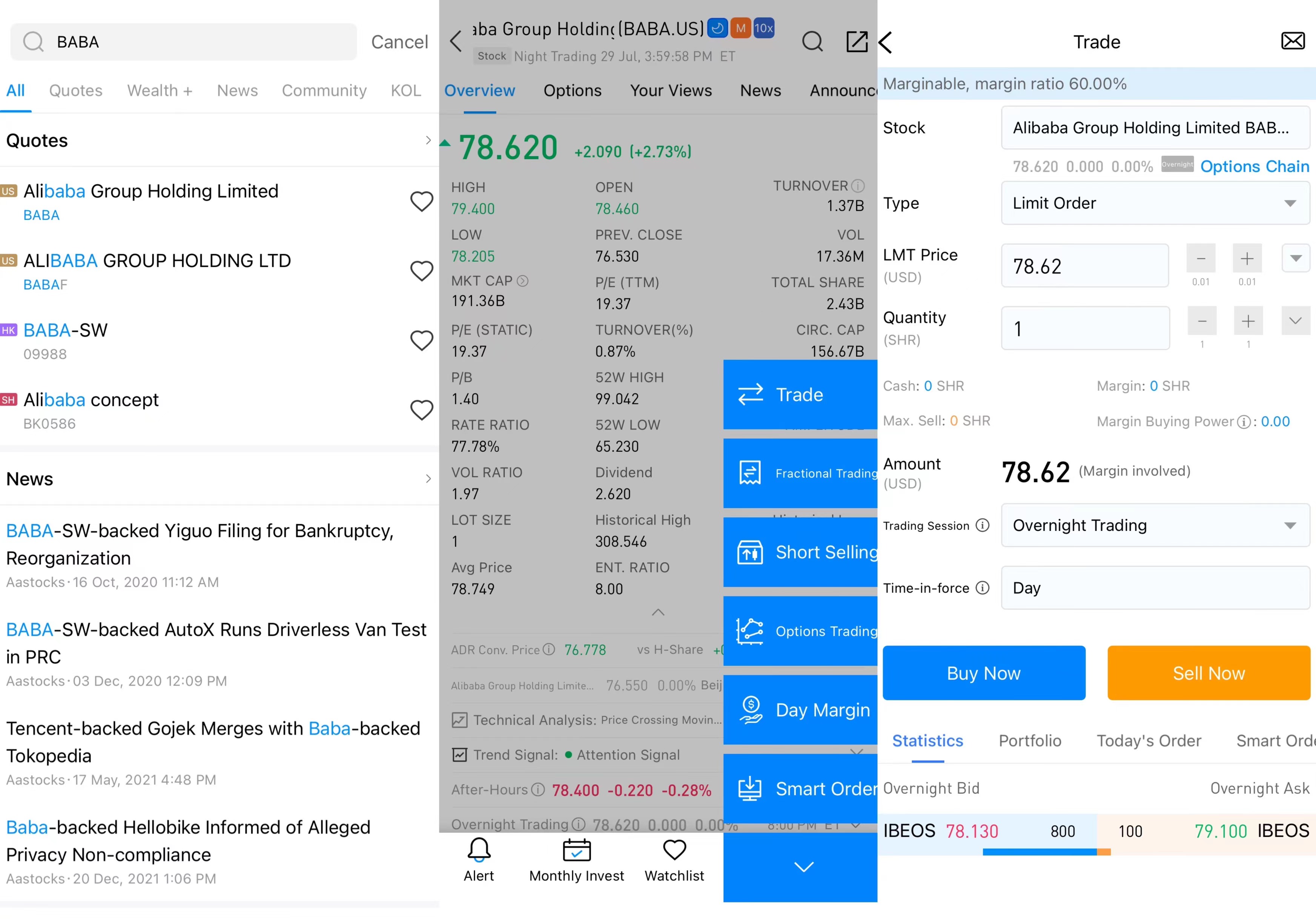 After logging in to uSMART HK APP, click "Search" from the upper right corner of the page, enter "BABA" or "Alibaba", you can enter the details page to learn about transaction details and historical trends, click "Trade" in the lower right corner, and select "Buy/ "Sell" function, finally fill in the transaction conditions and send the order; the picture operation instructions are as follows: