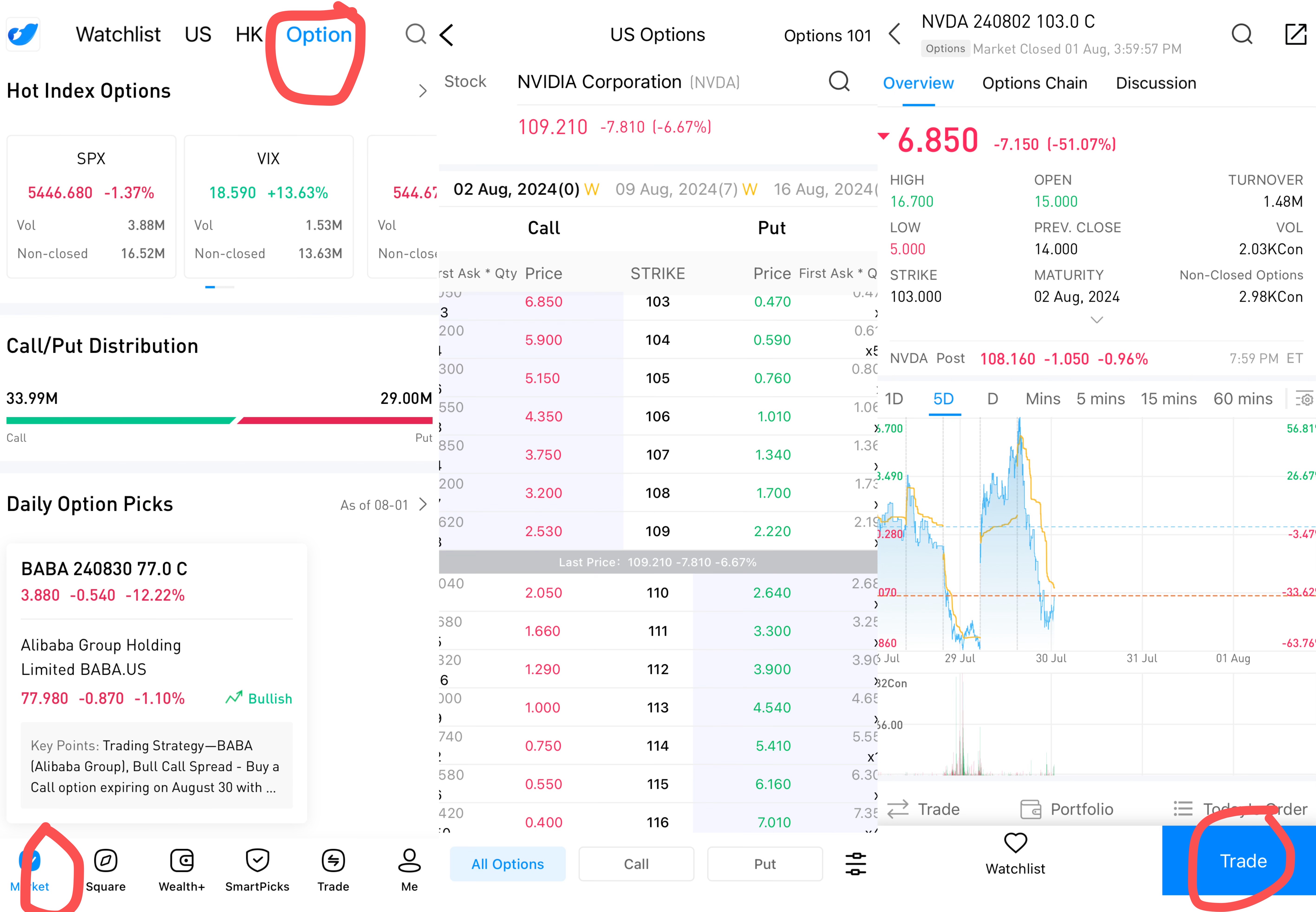 After logging into uSMART HK APP, click Options from the top of the page to enter the option details page to learn about options. Click on the specific option, click on the exercise price number, then click "Trade" in the lower right corner, fill in the transaction conditions and unlock the transaction; the picture operation instructions are as follows: