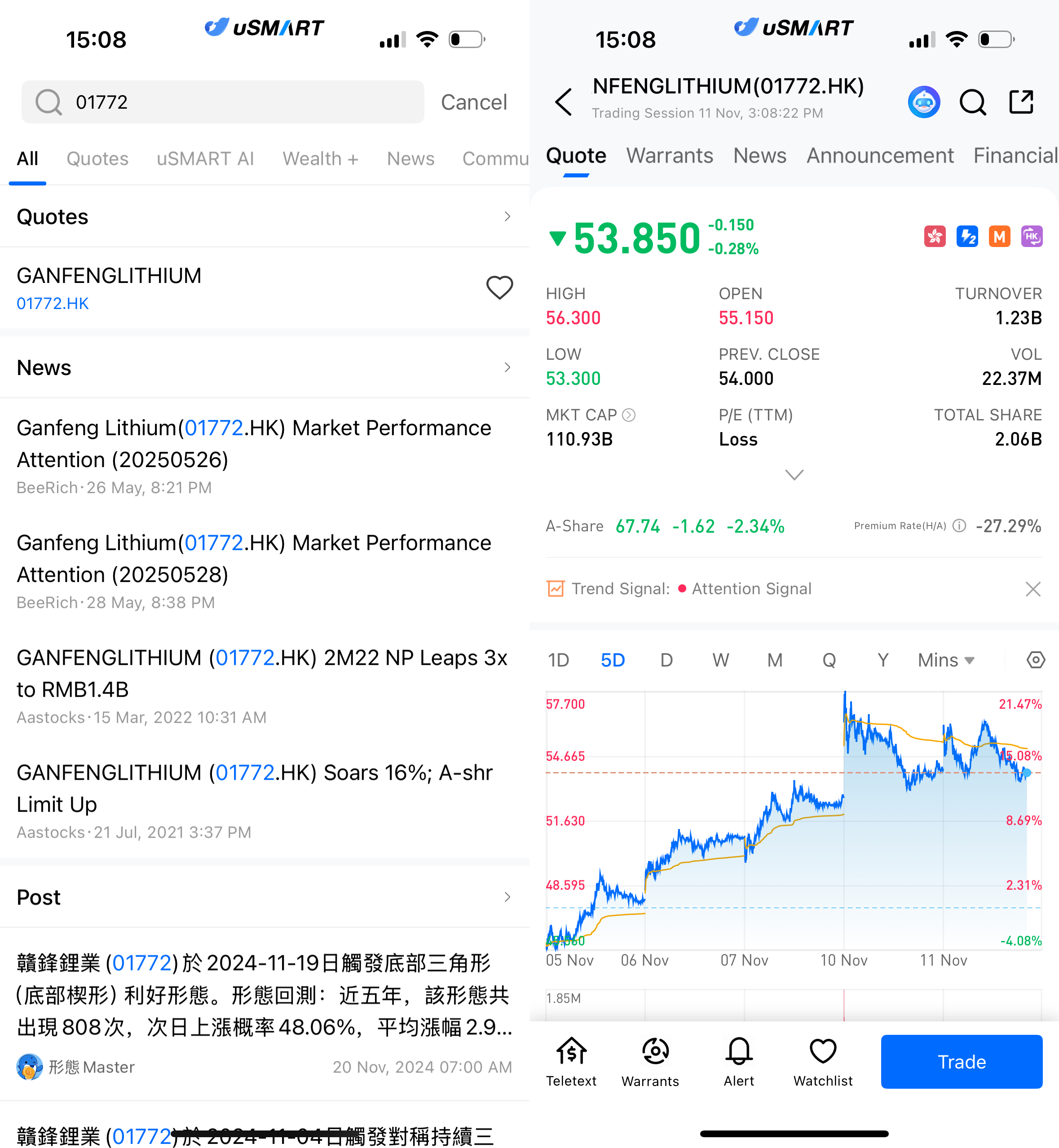 After logging into the uSMART HK App, tap the search icon in the top-right corner, enter the stock code (01772.HK), and open the details page to view trading and historical information. Then tap “Trade” at the bottom-right, select the order type, enter your trading conditions, and submit your order.