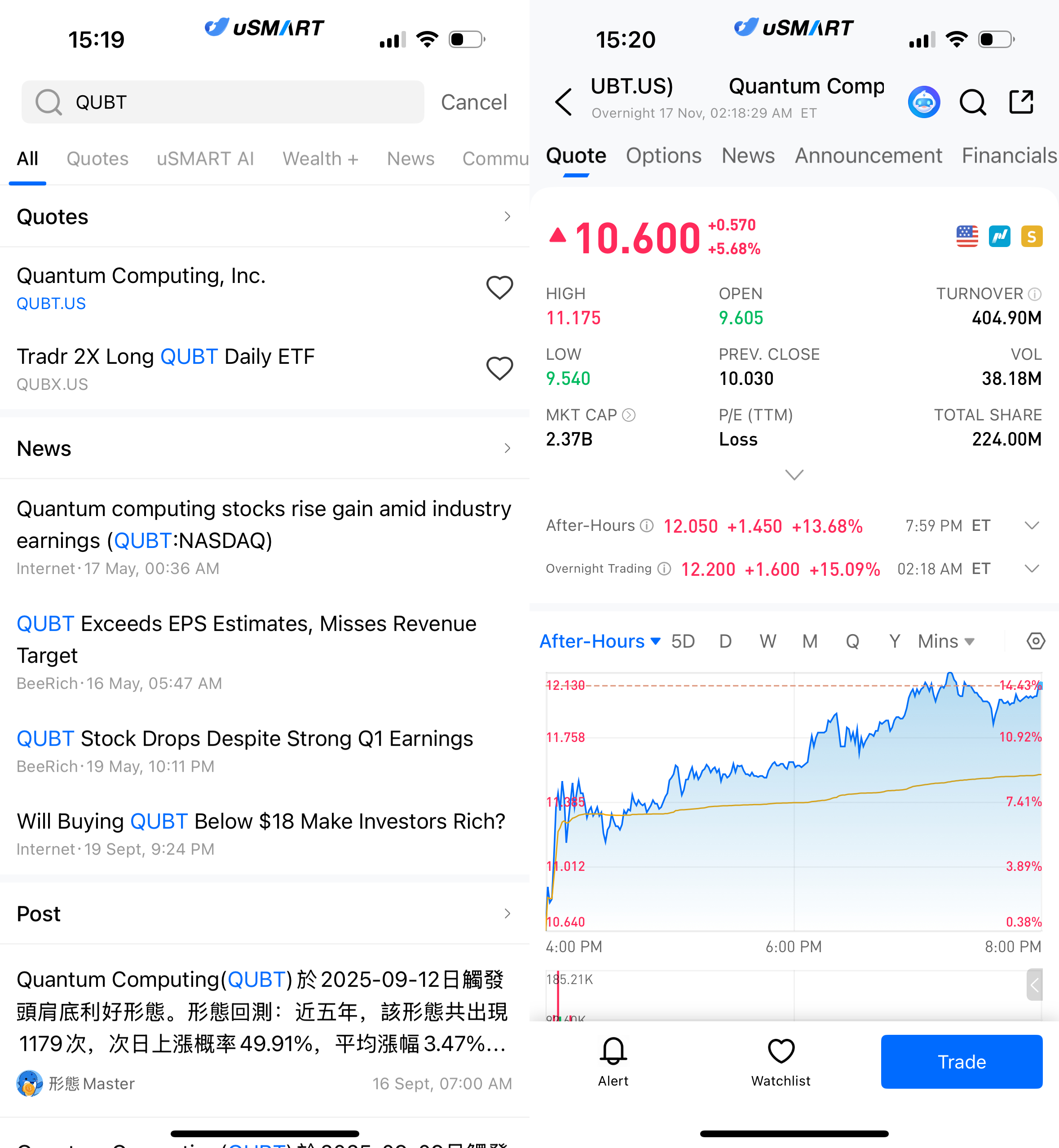 After logging into the uSMART HK app, click the “Search” button in the top-right corner of the page, enter the ticker code (QUBT.US), and navigate to the details page to view transaction details and historical trends. Click the “Trade” button in the bottom-right corner, select the trade type, and submit your order after filling in the transaction conditions.
