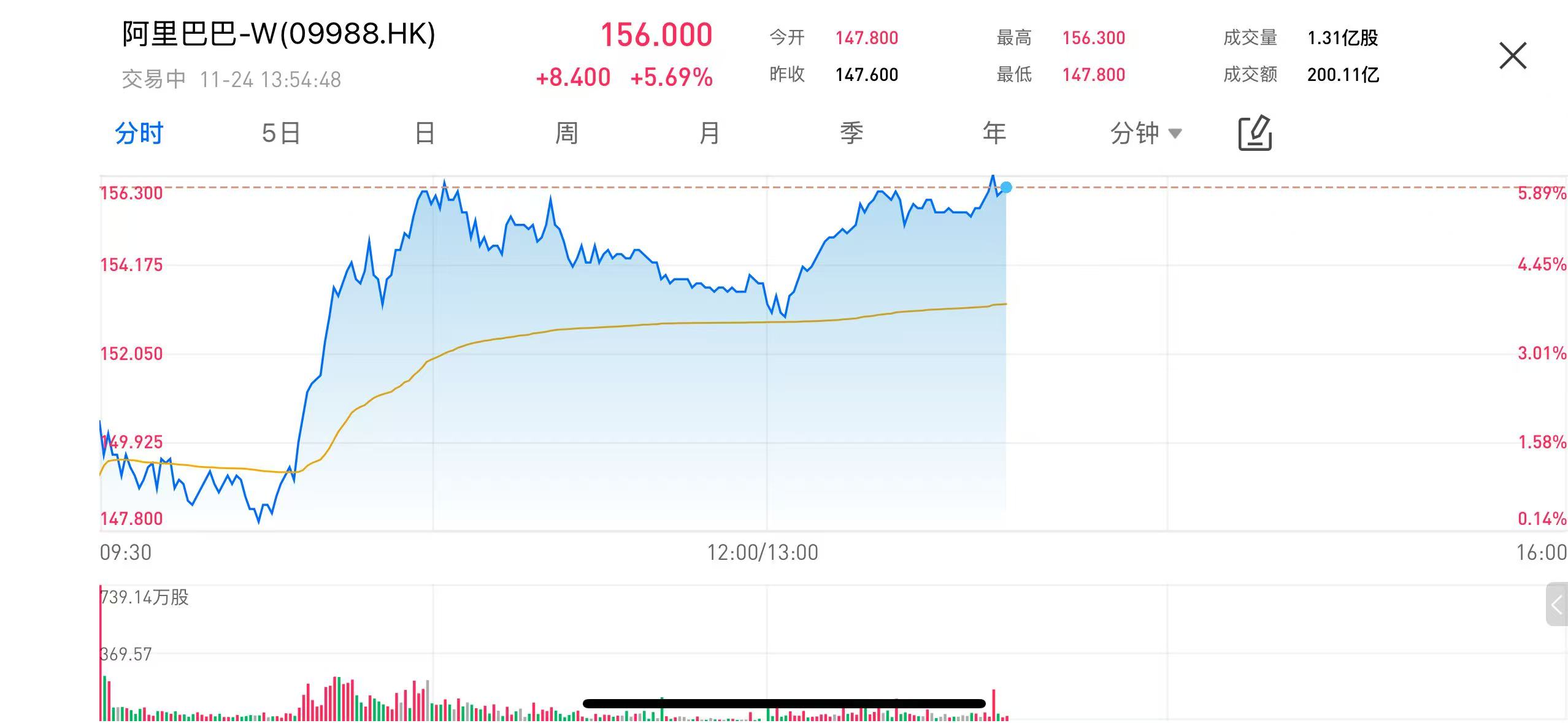 November 24, 2025 — Alibaba Group-W (09988.HK) saw a significant surge in its stock price during early trading today. As of 14:10, the stock price was reported at HKD 156.000, up 5.69% for the day. The stock hit an intraday high of HKD 156.300, with the opening and lowest points recorded at HKD 147.800. From the intraday chart, it’s clear that after a quick rally in the morning, the stock maintained strong support, with a trading volume of 131 million shares and a turnover of HKD 20.011 billion. The high trading volume and active investor sentiment reflect the market's positive outlook, particularly within the tech sector.