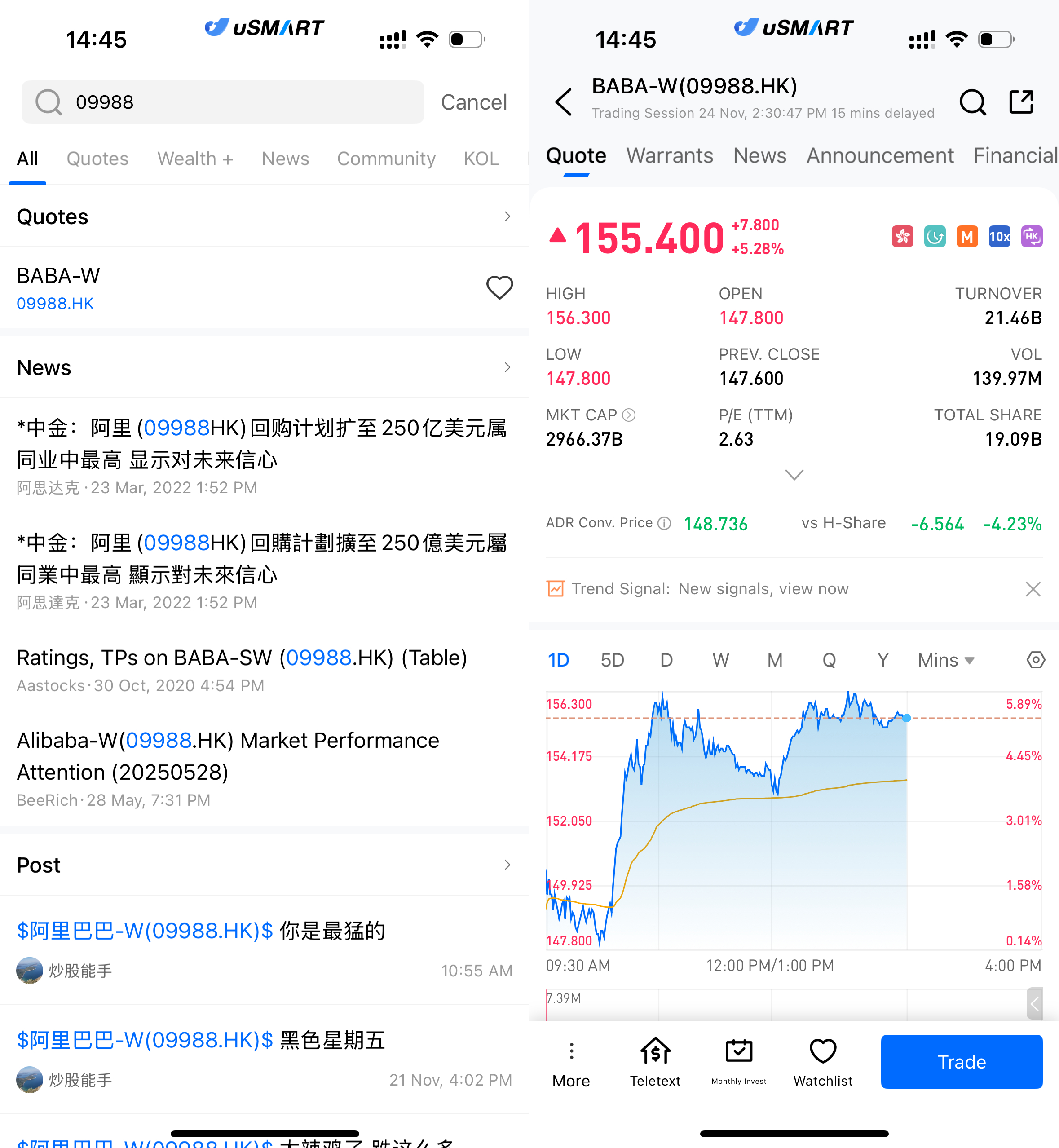 After logging into the uSMART HK app, click the “Search” button in the top-right corner of the page, enter the ticker code (09988.HK), and navigate to the details page to view transaction details and historical trends. Click the “Trade” button in the bottom-right corner, select the trade type, and submit your order after filling in the transaction conditions.