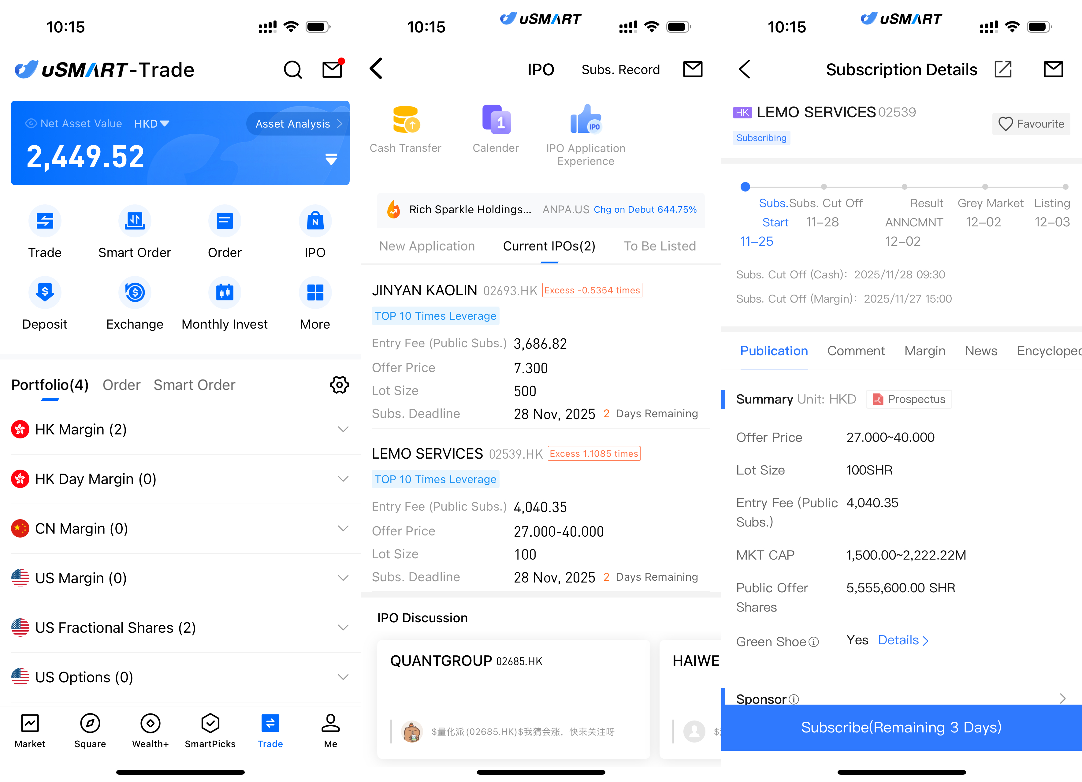 The uSMART HK App features an IPO Centre with exclusive perks, allowing clients to subscribe instantly to public offerings. After logging into the app, tap "Trade" at the bottom-right, go to "IPO Subscription," select Lemo Services, tap "Public Offer," enter your subscription quantity, and submit your order.