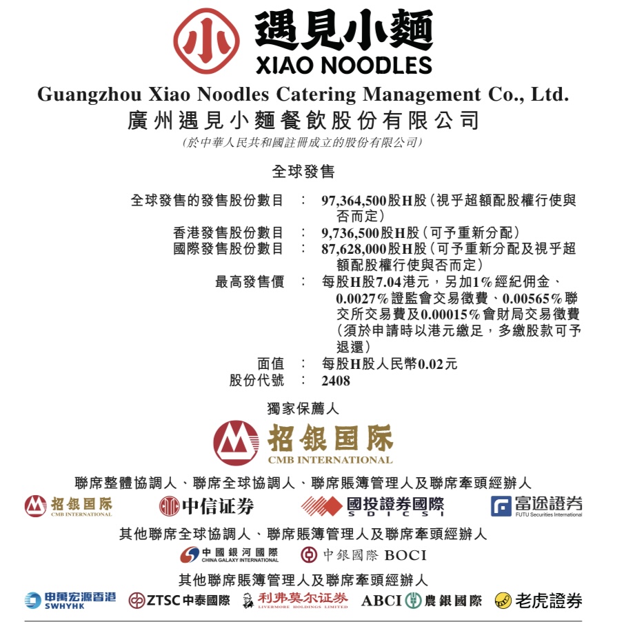 Guangzhou Xiao Noodles Catering Management Co., Ltd., (02408.HK) has launched its Hong Kong IPO. The offering period will run from November 27 to December 2, 2025, with a global issuance of approximately 97,364,500 H-shares and an over-allotment option of 15%. The offering price range is HK$5.64 to HK$7.04 per share, with a board lot size of 500 shares, and an entry fee of approximately HK$3,555.51. The listing is expected on December 5, 2025, on the main board of the Hong Kong Stock Exchange, with CMB International as the sole sponsor.