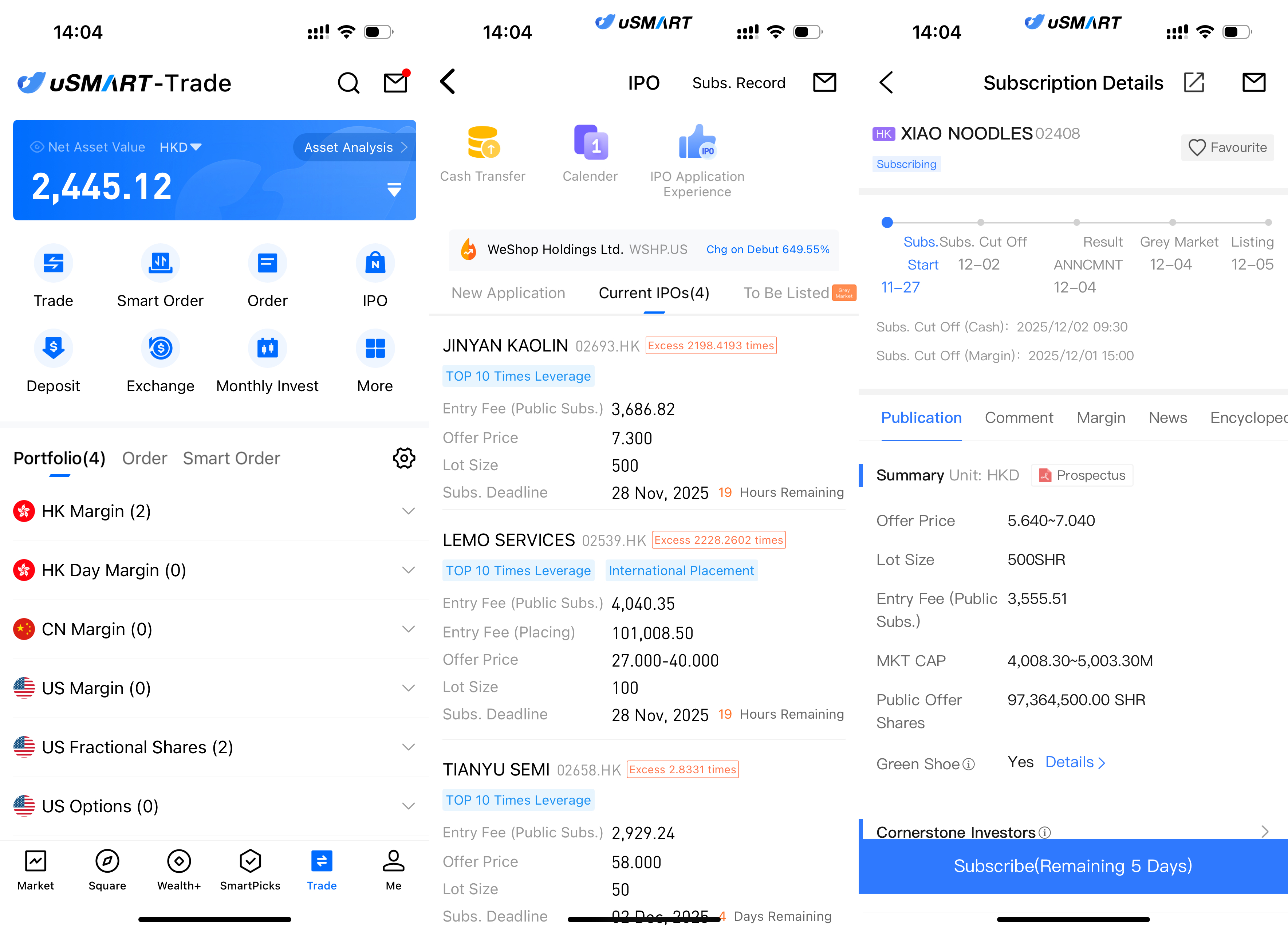 The uSMART HK App features an IPO Centre with exclusive perks, allowing clients to subscribe instantly to public offerings. After logging into the app, tap "Trade" at the bottom-right, go to "IPO Subscription," select Xiao Noodles, tap "Public Offer," enter your subscription quantity, and submit your order.