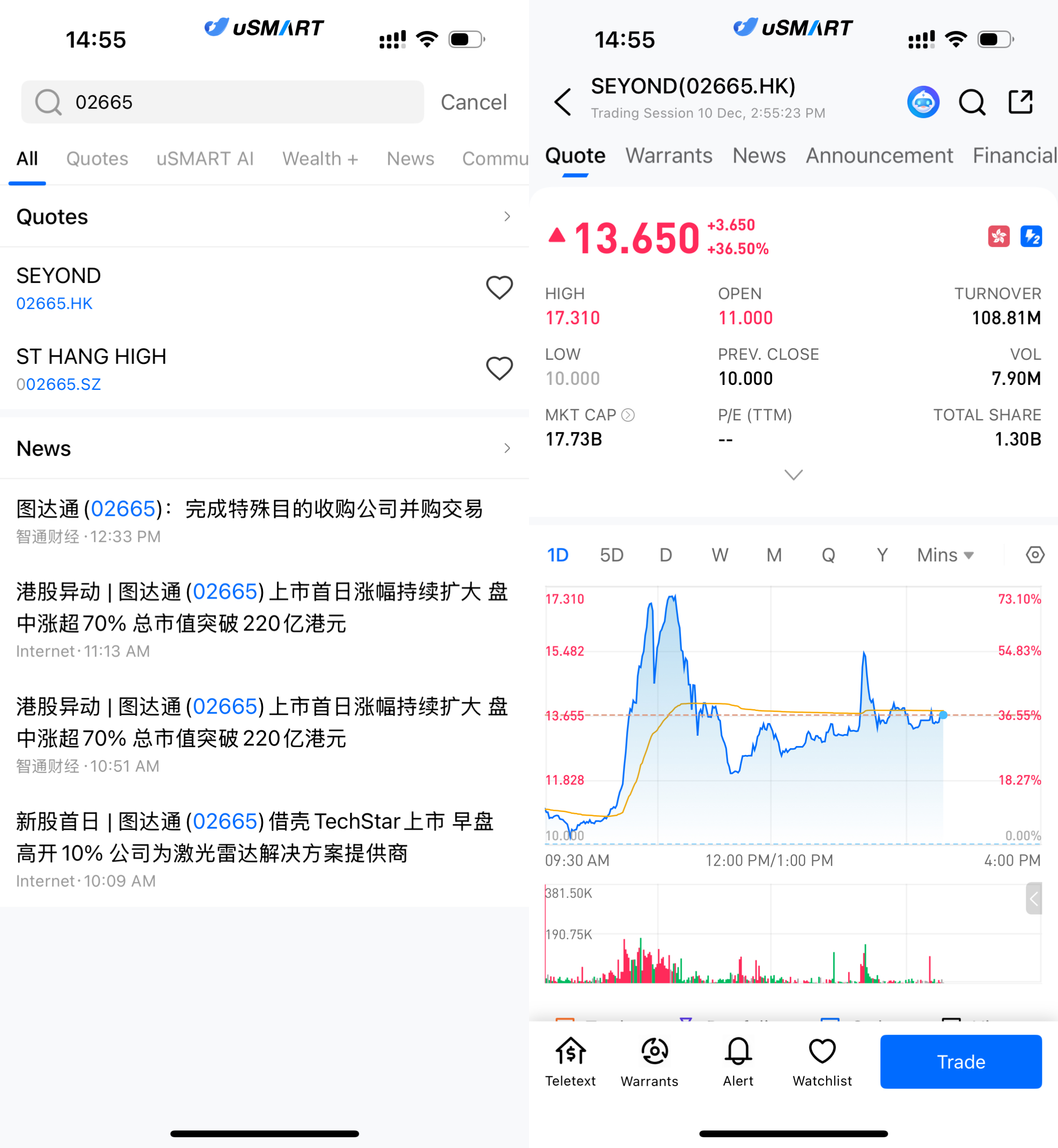 After logging into the uSMART HK app, click the “Search” button in the top-right corner of the page, enter the ticker code (02665.HK), and navigate to the details page to view transaction details and historical trends. Click the “Trade” button in the bottom-right corner, select the trade type, and submit your order after filling in the transaction conditions.