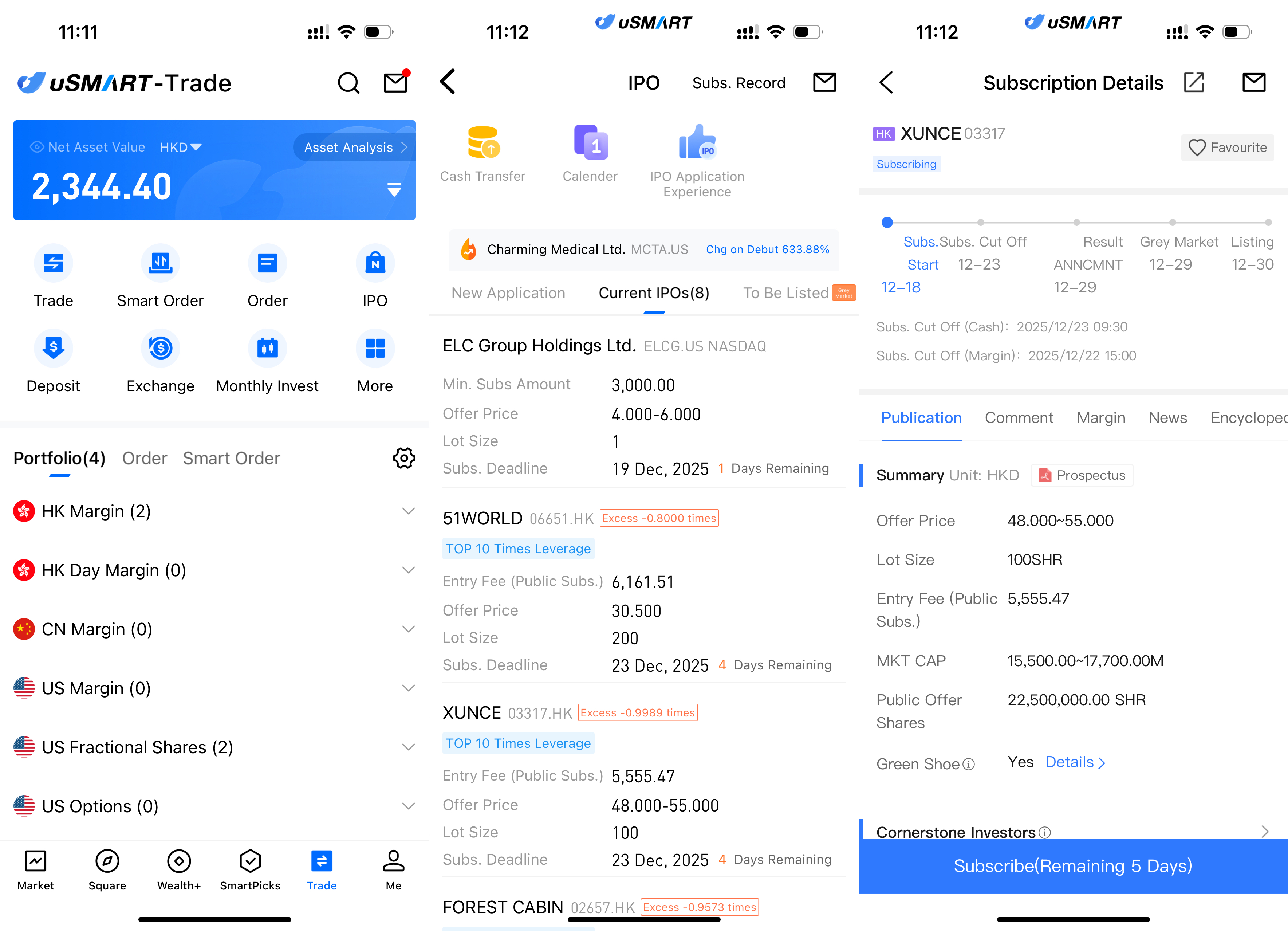 The uSMART HK App features an IPO Centre with exclusive perks, allowing clients to subscribe instantly to public offerings. After logging into the app, tap "Trade" at the bottom-right, go to "IPO Subscription," select Xunce, tap "Public Offer," enter your subscription quantity, and submit your order.
