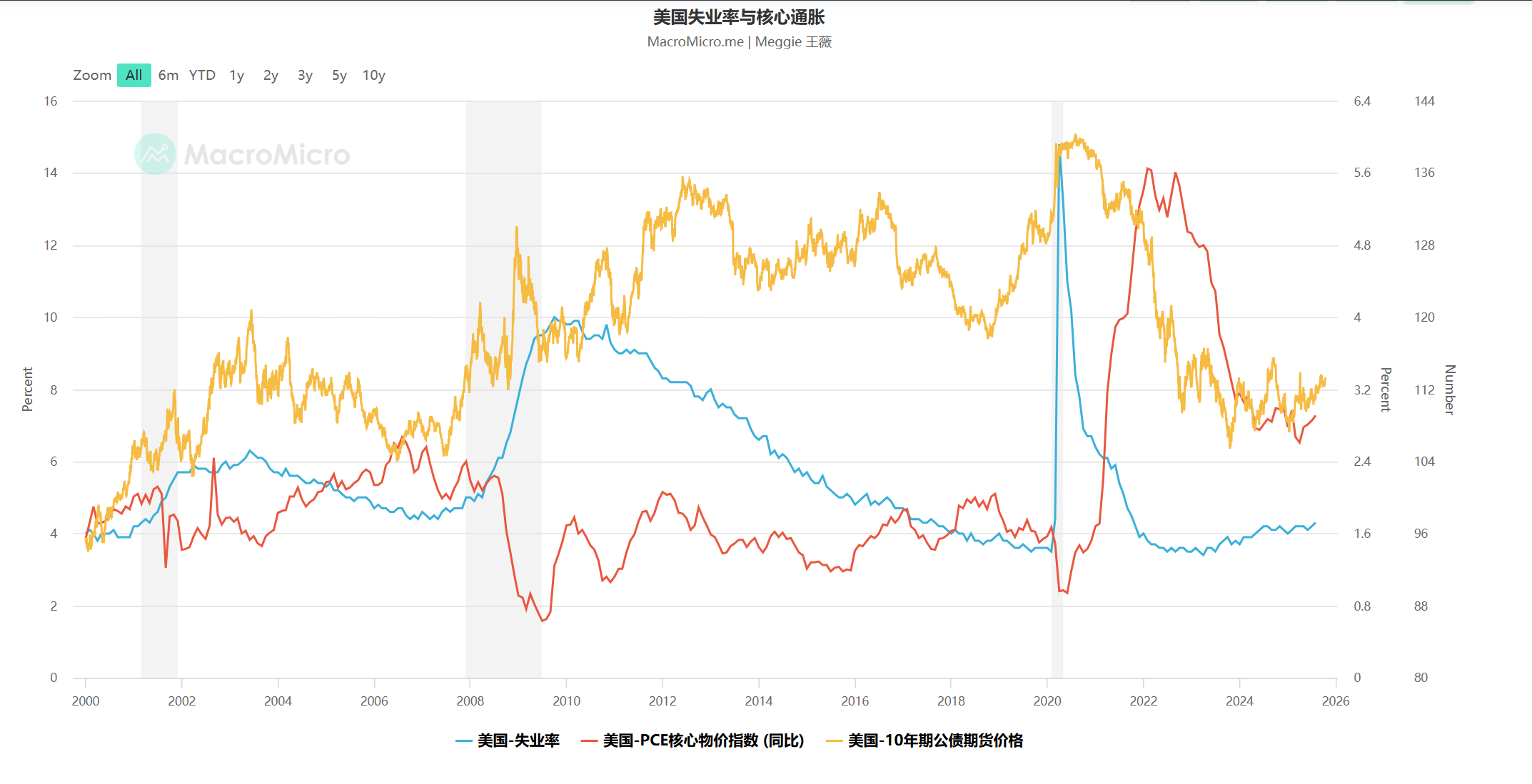 从宏观数据来看,美国就业市场仍保持强劲,失业率维持在4%附近,而核心PCE通胀同比仍高于目标区间,显示价格黏性仍在。与此同时,10年期美债价格震荡下行,反映出市场对未来利率路径的分歧与谨慎。