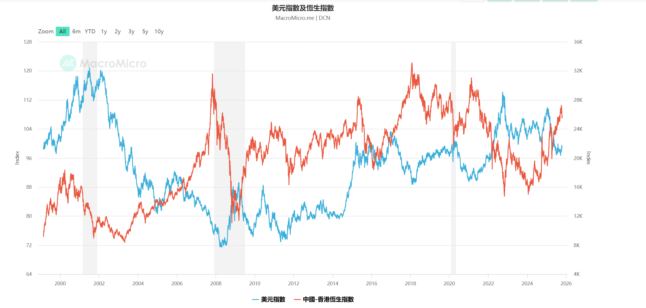 美元指数与恒生指数的走势在过去数年中呈现明显反向关系。当美元走弱、美国进入宽松周期时,港股往往获得资金回流与估值修复的机会;反之,强美元阶段通常意味着新兴市场承受资本外流压力。近期美元维持相对强势,也一定程度上限制了港股的反弹空间。