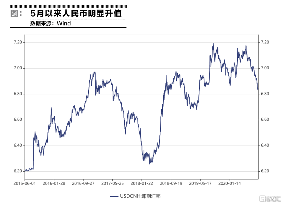 也就是说,中国由于先受到疫情冲击,也比欧美更先进入复苏。这种错位使我们看到,二季度以来,中国经济的表现要明显好于欧美,从而对人民币形成支撑。