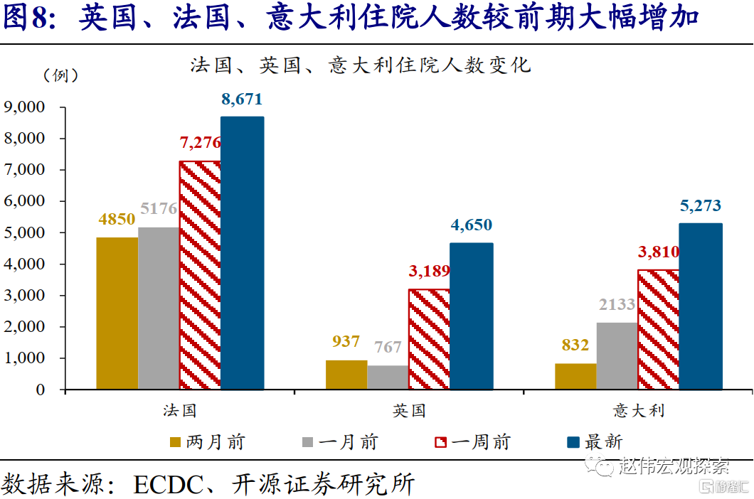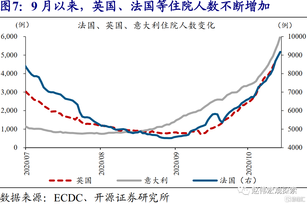 因疫情反弹速度过快、快速消耗医疗资源等,欧洲多国新增死亡病例大增。受疫情快速反弹影响,英国、法国、意大利住院人数分别升至8671人、4650人、5273人,远超2个月前。医疗资源日趋紧张背景下,法国、西班牙、英国等每日新增死亡病例分别从2个月前的10~20例/天左右,大幅增加至100例/天上下。