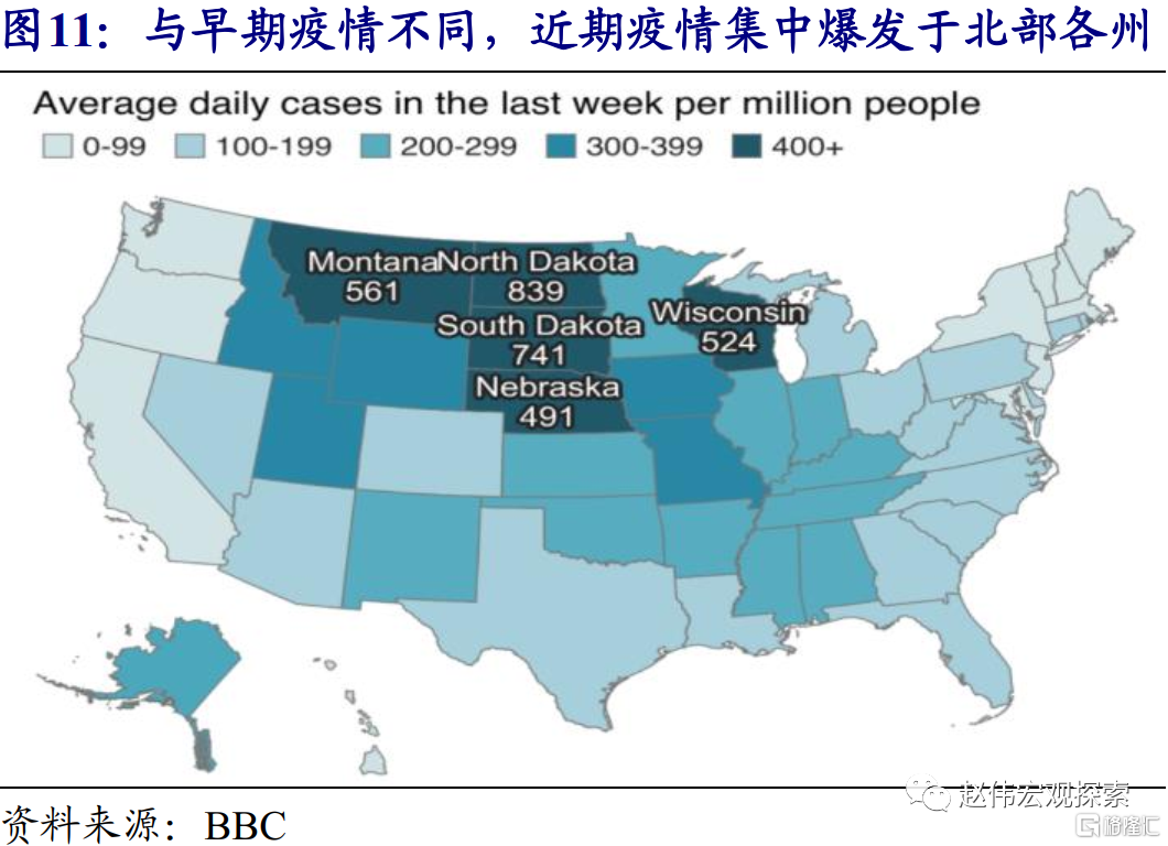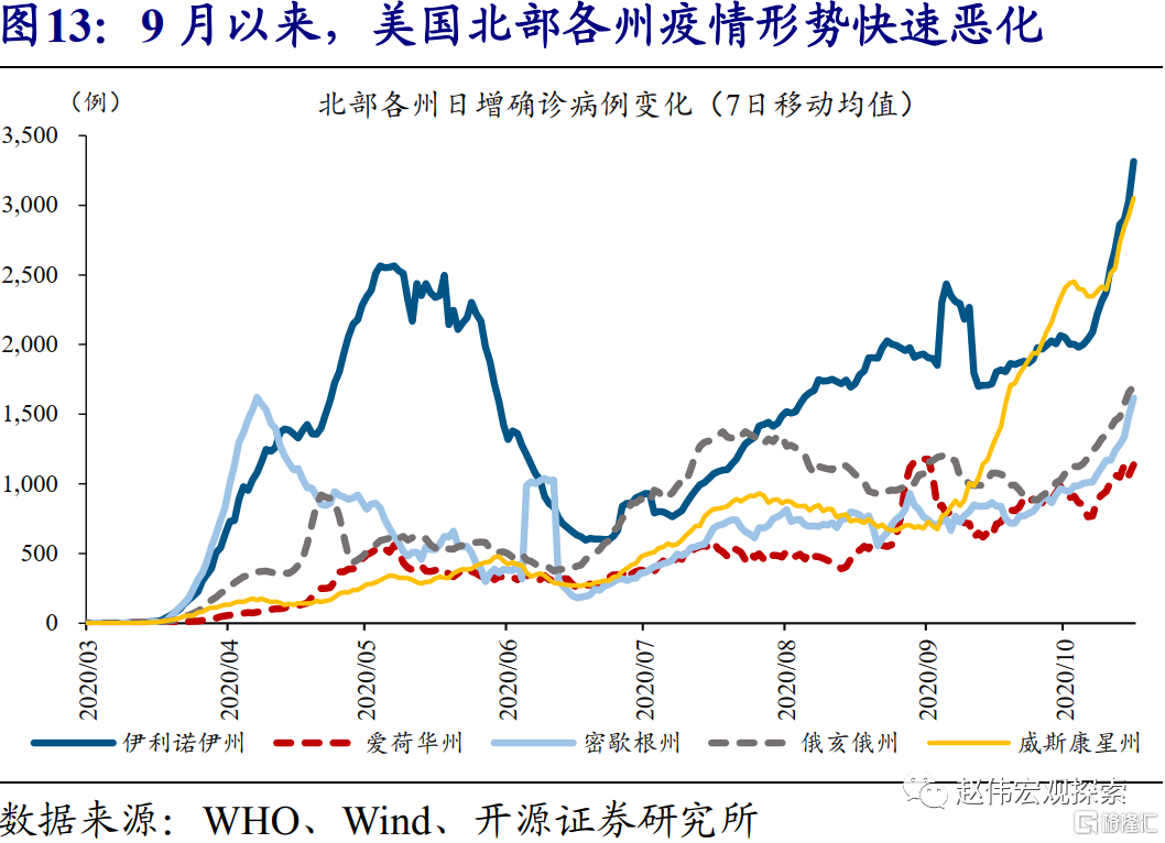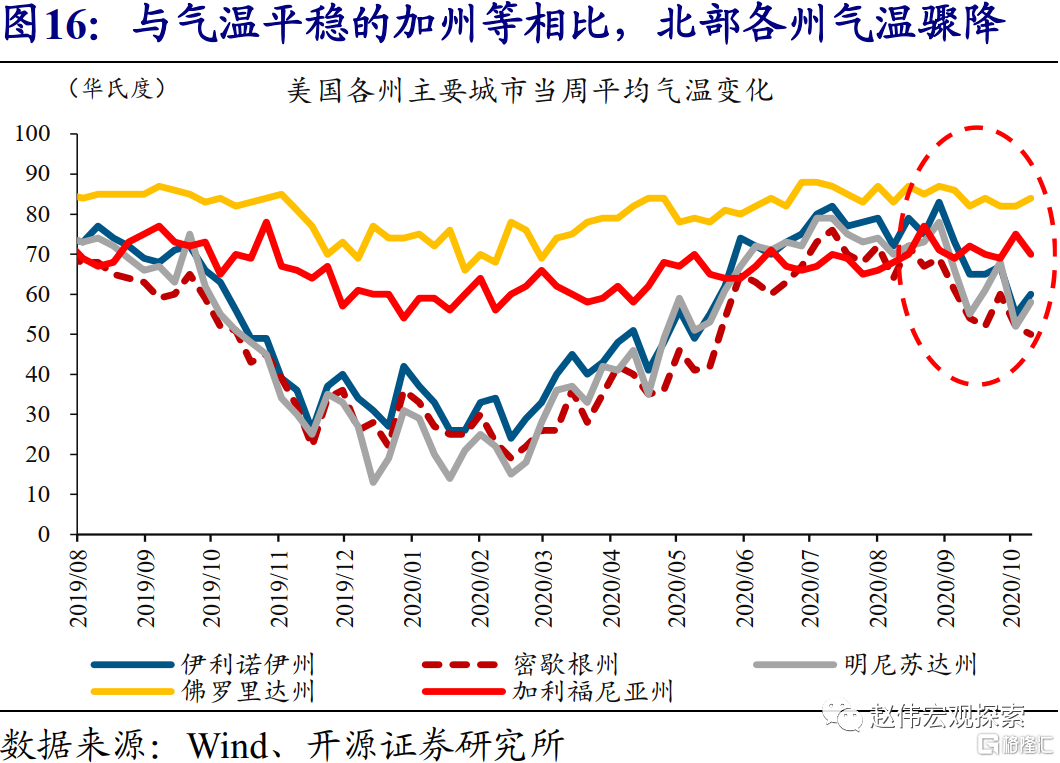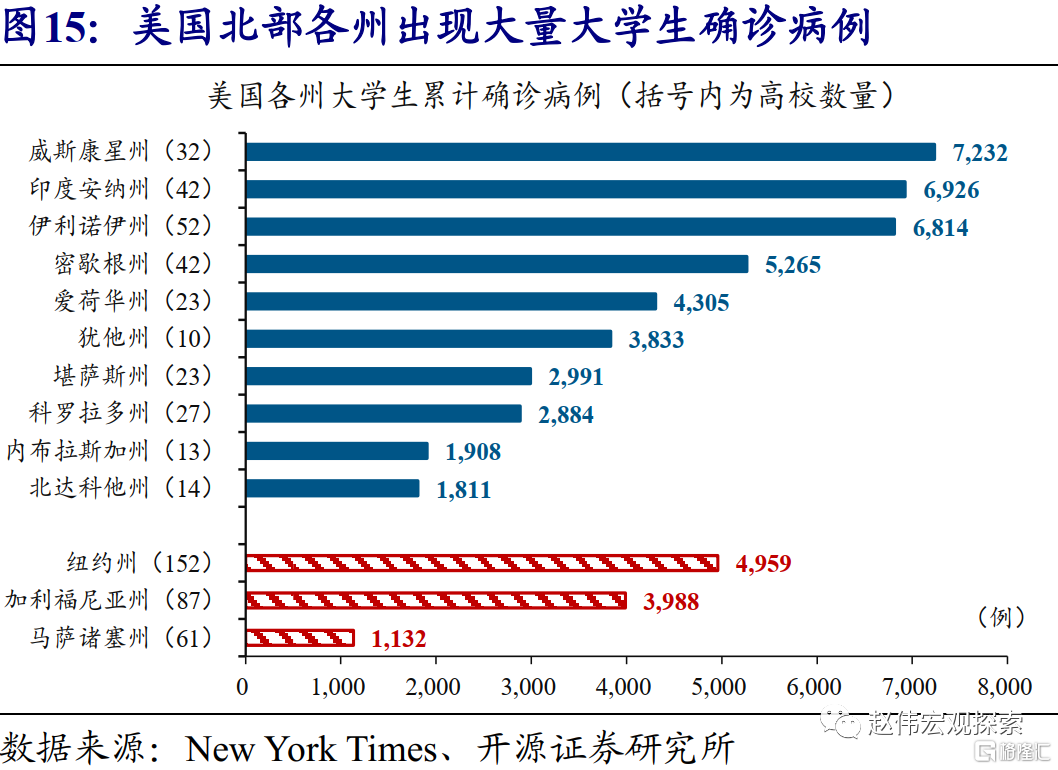 学生大规模返校及天气快速转凉,或是美国北部各州疫情大范围扩散的导火索。9月以来,州内高校迎来开学季、大量学生返校,或为美国北部各州疫情再度扩散的导火索。据《纽约时报》统计,虽然在高校数量上不占优,但威斯康星州、印第安纳州、伊利诺伊州等北部州的大学生累计感染人数,分别达到7232例、6926例、6814例,远超高校更加密集的纽约州、加利福尼亚州等。与此同时,与佛罗里达州、加利福尼亚州等气温较高的地区不同,美国多个北部州在9月后气温骤降,而这或加速了疫情的蔓延。