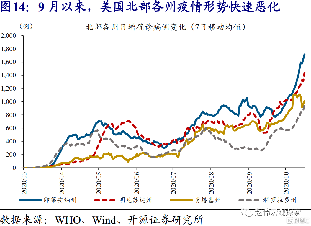 美国方面,疫情反弹主要集中在前期防控相对松散的北部各州。或缘于地处内陆、前期疫情形势不严重等,美国北部各州的疫情防控一直较为松散。9月疫情反弹后,美国北部各州疫情应对“迟缓”、错过最佳防控窗口,导致疫情形势进一步恶化。截至10月16日,俄亥俄州、印第安纳州等北部州的每日新增确诊病例,均已大超前期峰值。作为对比,纽约州、加利福尼亚州等美国前期疫情集中爆发州,因防控及时,疫情形势继续保持平稳。