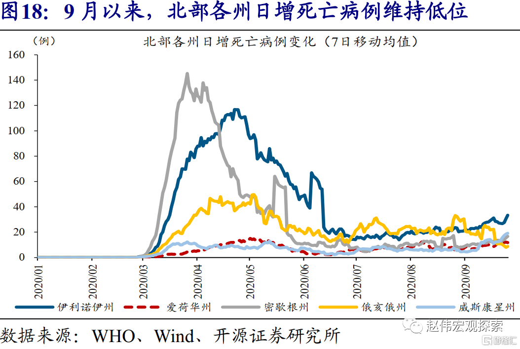 3)或因地处内陆、前期疫情不严重等,美国北部各州疫情防控一直较为松散。9月以来,随着州内高校迎来开学季、大量学生返校,以及气温骤降等,俄亥俄州、印第安纳州等美国北部州新增病例激增。但与欧洲不同,由于对州内养老院采取了严格的防护措施,及中青年病例死亡率较低等,北部各州新增死亡病例持续低企。