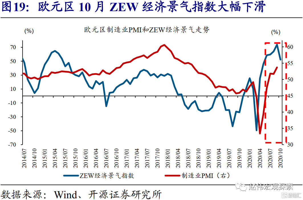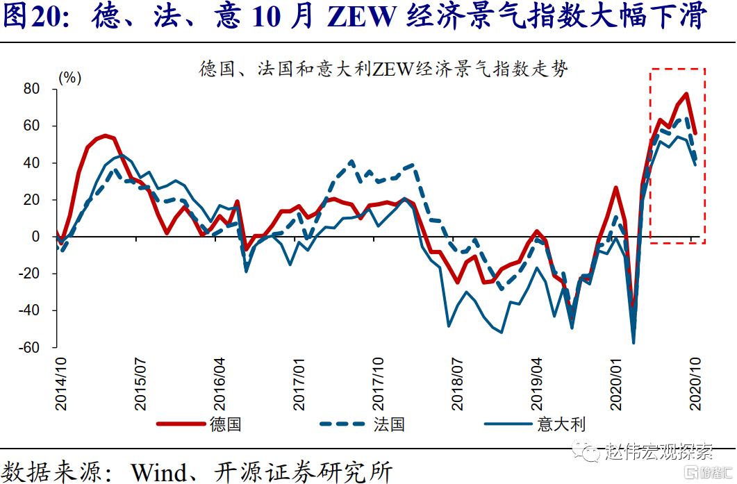 未来一段时间,密切关注欧洲各国疫情防控措施的实施;若防控效果不佳、新增死亡病例持续大增,欧洲各国或不得不重新实施封锁、半封锁等,显著影响经济修复进程。新一轮疫情大范围扩散后,欧洲经济景气大幅下滑。最新公布的经济领先指标显示,欧元区10月ZEW经济景气指数由前值73.9%大幅回落至52.3%,德国、法国10月ZEW经济景气指数也分别由77.4%、64.3%降至56.1%、42.3%。未来一段时间,需密切关注欧洲各国对疫情的防控。若无法有效遏制疫情蔓延、新增死亡病例大增,欧洲各国或将重新实施封锁或半封锁措施,显著影响经济修复进程。