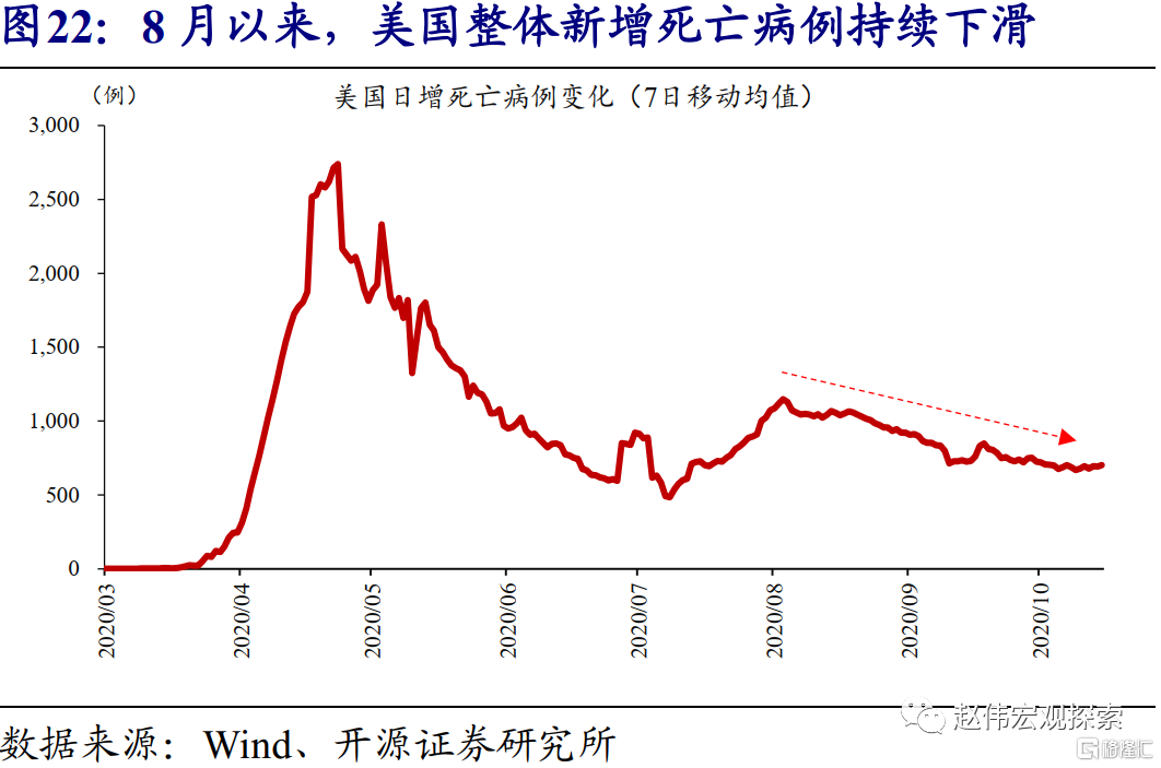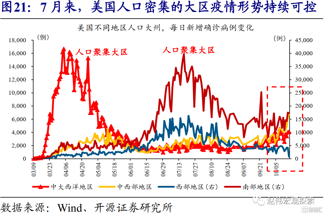 4)疫情反弹以来,欧洲经济景气出现快速下滑,欧元区、德国、法国等10月ZEW经济景气指数纷纷回落。未来一段时间,密切关注欧洲各国疫情防控措施的实施;若效果不佳、新增死亡病例持续大增,欧洲各国或不得不重新实施封锁、半封锁等,显著影响经济修复进程。5)美国人口主要聚集在中大西洋地区和南部地区,人口占全美比重超过60%。7月以来,不断提升防控力度下,美国中大西洋和南部地区疫情逐渐可控,新增死亡病例不断下滑。相比欧洲,在主要人口大州控制住疫情、新增死亡病例持续低企背景下,美国疫情风险或整体可控,不改经济继续向好前景。