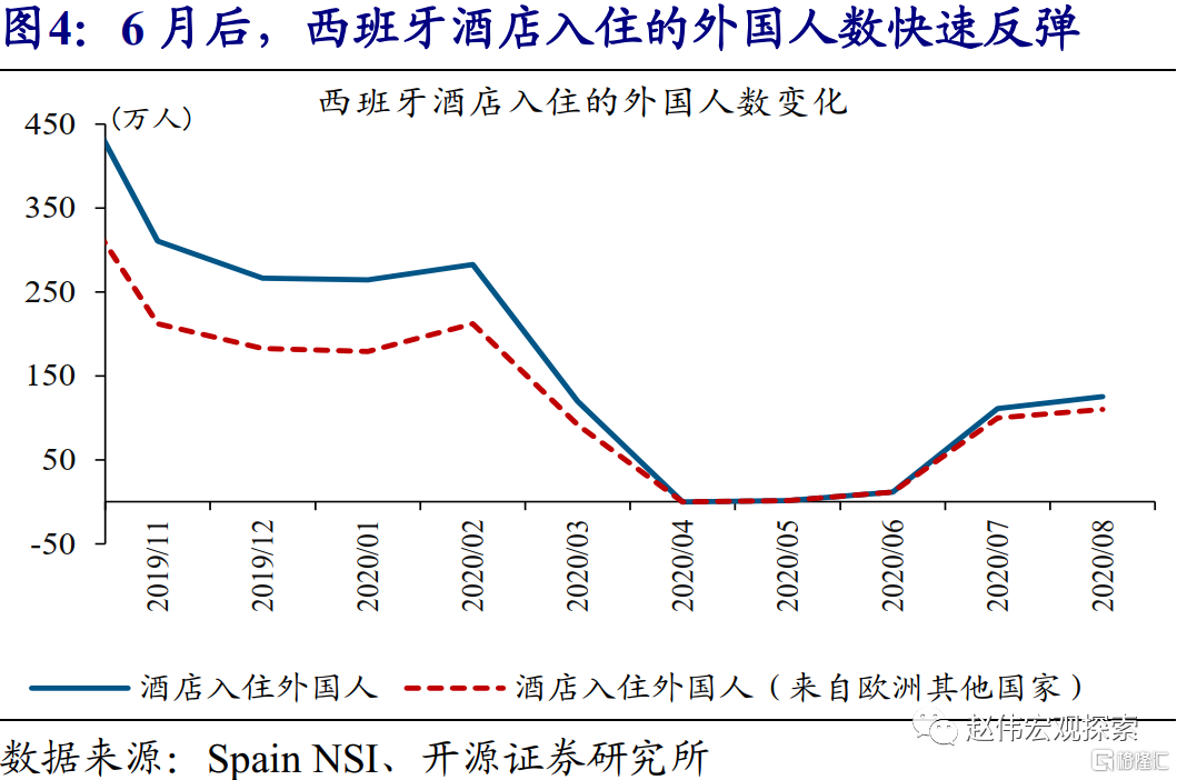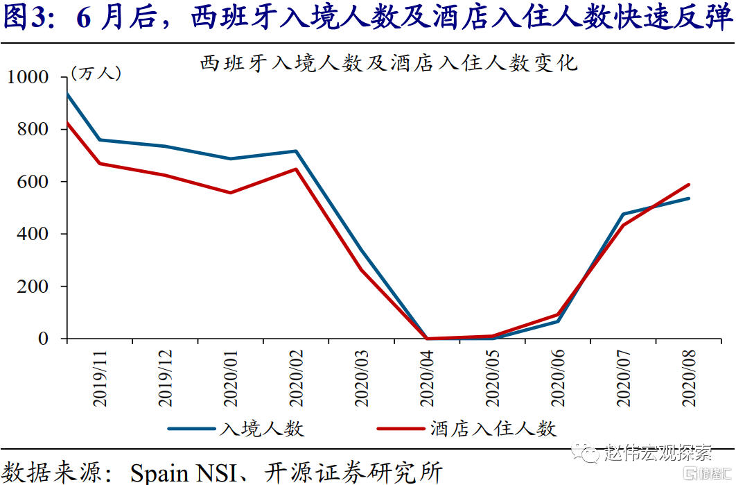 期疫情防控松散,叠加大量游客来往于西班牙、法国等旅游胜地与本国之间,埋下欧洲疫情反弹隐患。6月后,随着疫情形势有所好转,欧洲各国为提振经济,相继放松疫情防控、开放边境。其中,法国、西班牙等欧洲旅游胜地的做法最为激进,尤其是西班牙,宣布全球游客无需病毒检测即可入境。放松疫情防控、激进放开边境,使西班牙的入境人数、酒店入住人数等(主要来自欧洲其他国家),快速修复至疫情前水平附近。但大量游客来往于西班牙、法国等旅游胜地与本国之间,也埋下了欧洲疫情反弹的隐患。