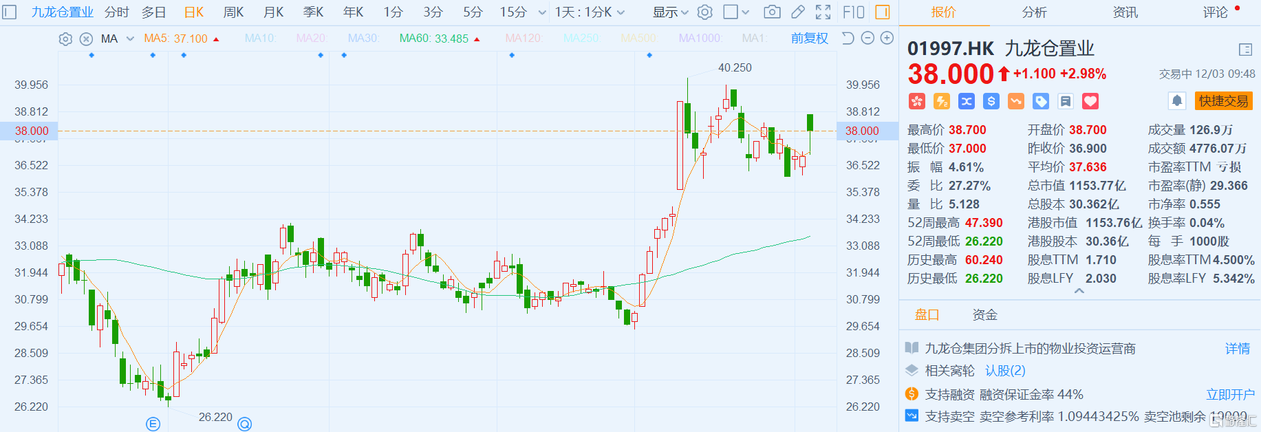 格隆汇12月3日丨九龙仓置业(1997.HK)今早高开约5%,随后一度接近翻绿,现涨近3%,报38港元,总市值1154亿港元。瑞银发表报告指,在最新租金出现企稳迹象下,香港取消非住宅双重印花税可能会刺激短期办公室及零售市场气氛。汇证发布报告,料九龙仓置业下半年盈利见底,维持目标价49.2港元。摩根士丹利发表报告,把九龙仓置业评级上调至“增持”,目标价42港元。