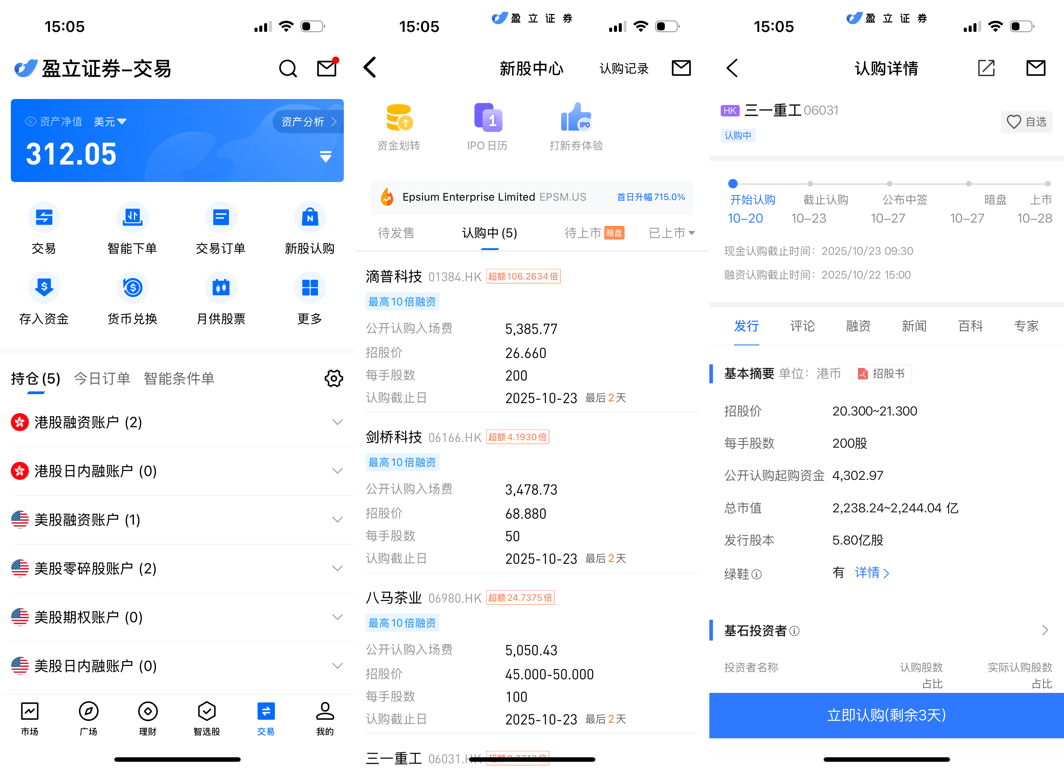 uSMART HK App 设有 IPO 中心,提供独家优惠,客户可在 App 即时认购公开发售之新股。登入 uSMART HK App 后,点选右下角「交易」,进入「新股认购」,选择三一重工后点击「公开认购」,填写认购数量并提交订单即可。