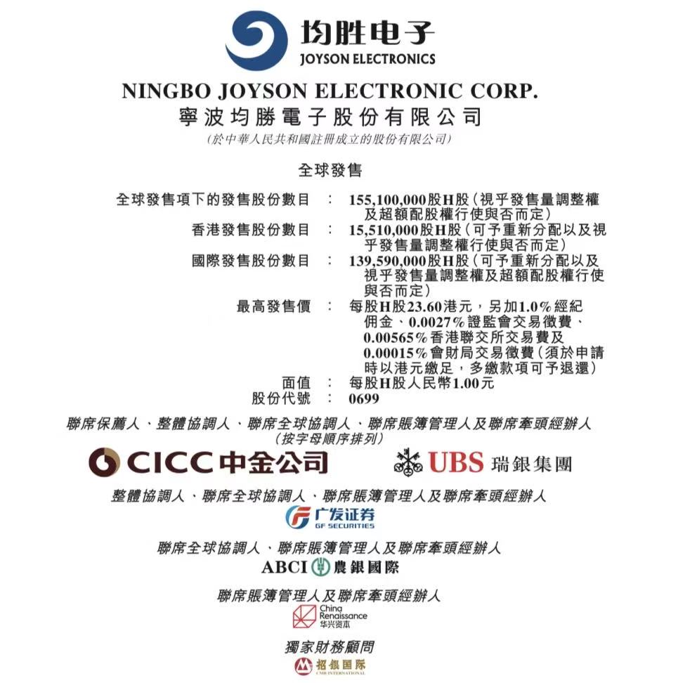 均胜电子(JOYSON ELECTRONICS, 0699.HK)启动香港IPO,招股期为10月28日至11月3日,拟全球发售155,100,000股H股,并设15%超额配股权;每股发售价不超过23.60港元,每手500股,入场费约11,919.01港元;预期11月6日于联交所主板挂牌,联席保荐人为中金公司及瑞银集团。