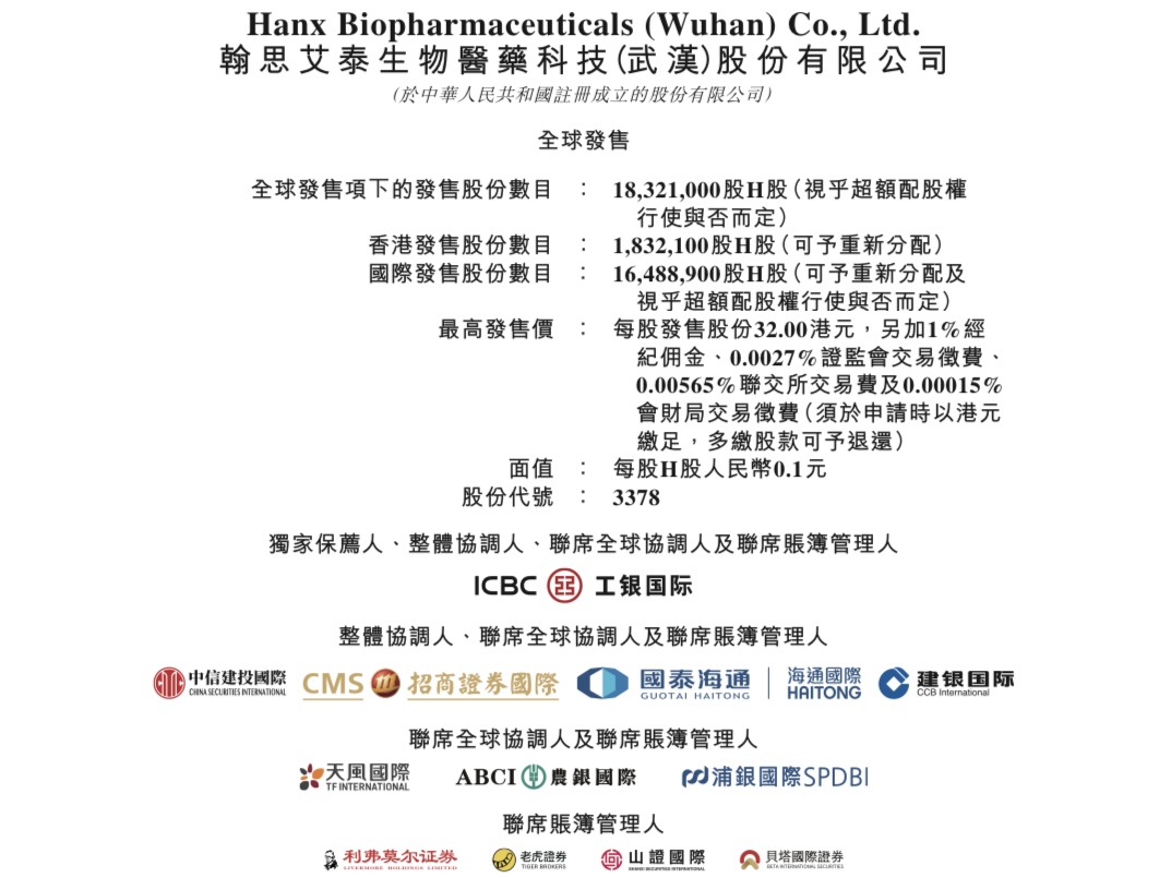 翰思艾泰生物医药科技(武汉)股份有限公司(Hanx Biopharmaceuticals (Wuhan) Co., Ltd., 3378.HK)启动香港IPO,招股期为12月15日至12月18日,拟全球发售约18,321,000股H股,并设15%超额配股权;每股发售价介乎28.00—32.00港元,每手100股,入场费约3,232.32港元;预期12月23日于联交所主板挂牌,工银国际融资有限公司为独家保荐人。