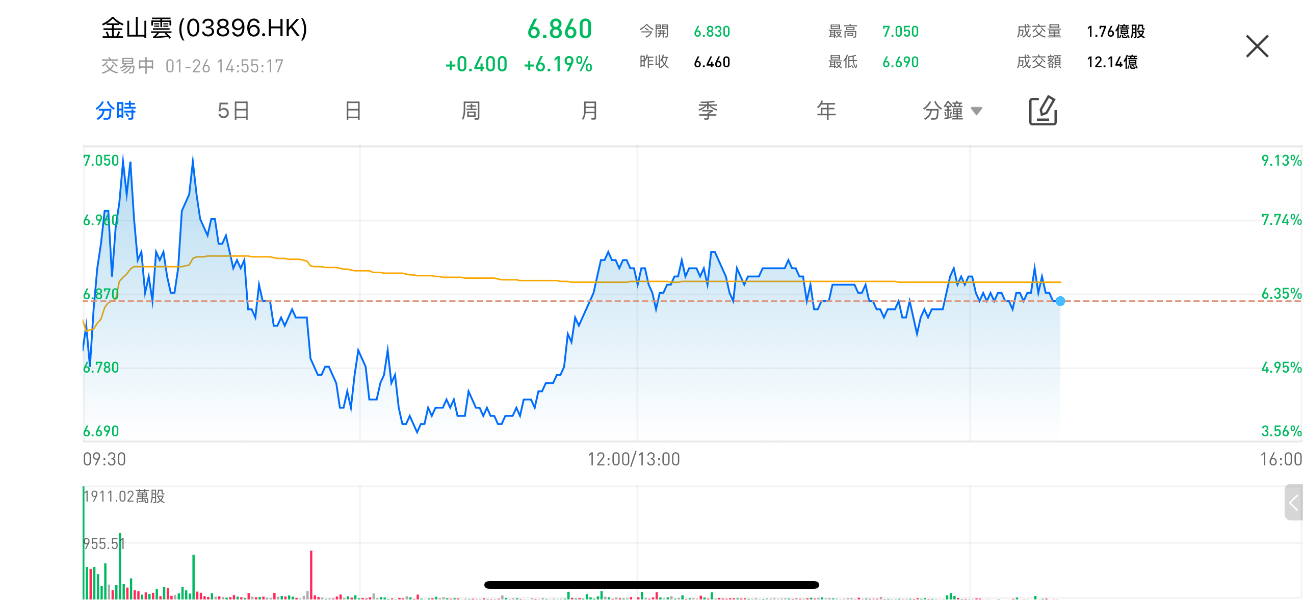 2026年1月26日,金山云(03896.HK)股价今日呈现显著上涨。金山云的股价达到了6.860港元,较昨日收盘价6.460港元上涨了6.19%。此波上涨正值金山云在其年度Tech Talk大会中宣布对金山云星流平台进行战略升级之际。投资者对公司的创新战略及其在AI领域的进一步布局持乐观态度。