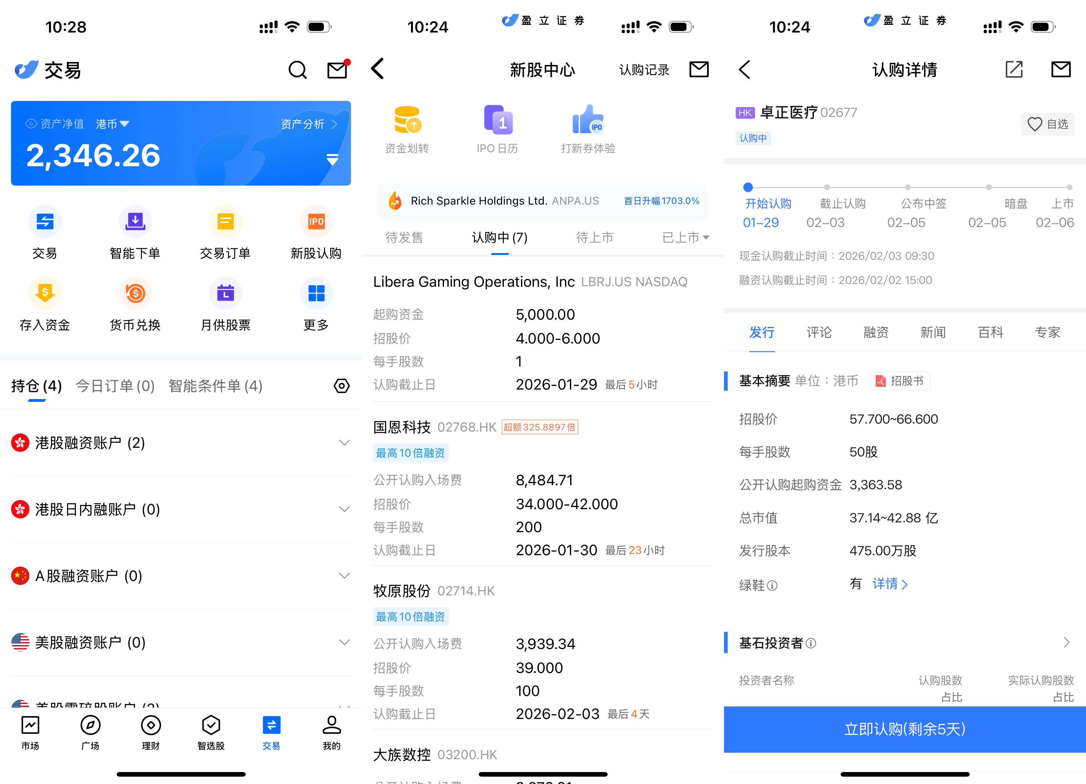uSMART HK App 设有 IPO 中心,提供独家优惠,客户可在 App 即时认购公开发售之新股。登入 uSMART HK App 后,点选右下角「交易」,进入「新股认购」,选择卓正医疗后点击「公开认购」,填写认购数量并提交订单即可。