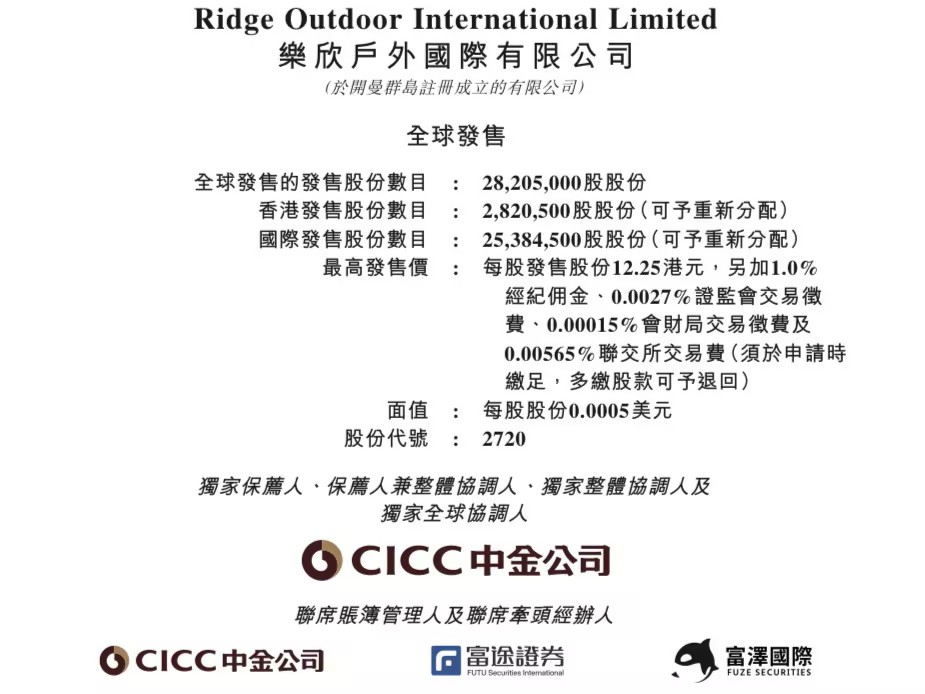 乐欣户外国际有限公司(Ridge Outdoor International Limited, 2720.HK)启动香港IPO,招股期为2026年1月31日至2026年2月5日,拟全球发售28,205,000股,香港发售股份数目2,820,500股,国际发售股份数目25,384,500股;每股发售价介乎11.25—12.25港元,每手500股,入场费约6,186.78港元;预期2026年2月10日于联交所主板挂牌,中金公司为独家保荐人。
