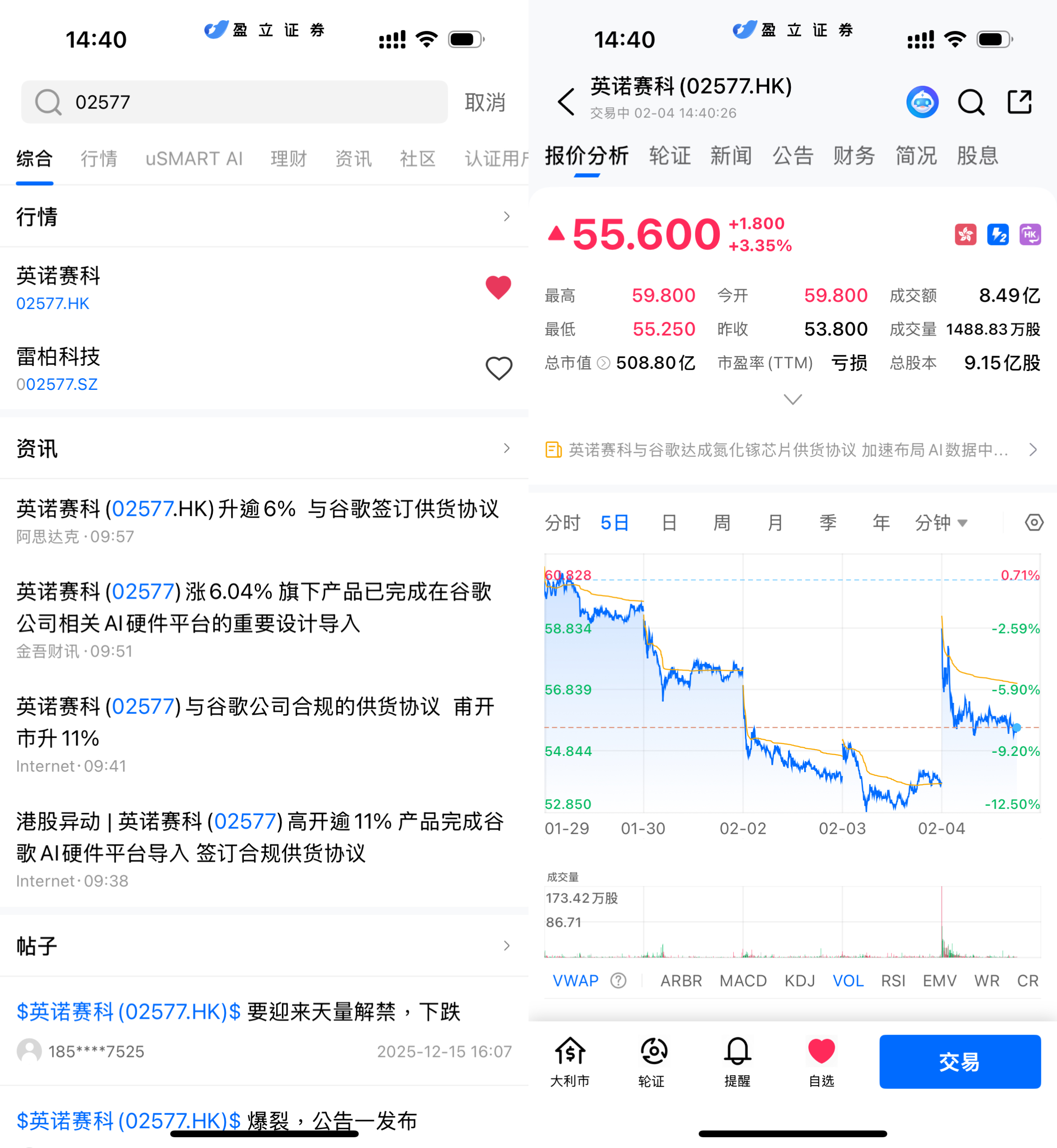 2 月 4 日,港股英诺赛科(02577.HK)股价早盘显著走强,一度冲高至 59.80 港元,盘中最高涨幅超过 11%。截至 14:42,英诺赛科报 55.40 港元/股,上涨 2.97%,成交额约 8.52 亿港元,交投显著放大,市场关注度持续升温。