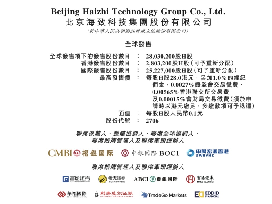 北京海致科技集团股份有限公司(Beijing Haizhi Technology Group Co., Ltd., 2706.HK)启动香港IPO,招股期为2026年2月5日至2月10日,拟全球发售28,030,200股H股;每股发售价介乎25.60—28.00港元,每手200股,入场费约5,656.48港元;预期2月13日于联交所主板挂牌,联席保荐人包括招银国际融资有限公司、中银国际亚洲有限公司及申万宏源融资(香港)有限公司。