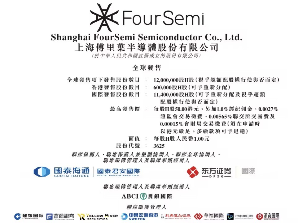 上海傅里叶半导体股份有限公司(FourSemi,03625.HK)启动香港IPO,招股期为3月23日至3月26日,拟全球发售12,000,000股H股,并设15%超额配股权;每股发售价介乎40.00—50.00港元,每手100股,入场费约5,050.43港元;预期3月31日于联交所主板挂牌,国泰君安融资及东方融资(香港)为联席保荐人。