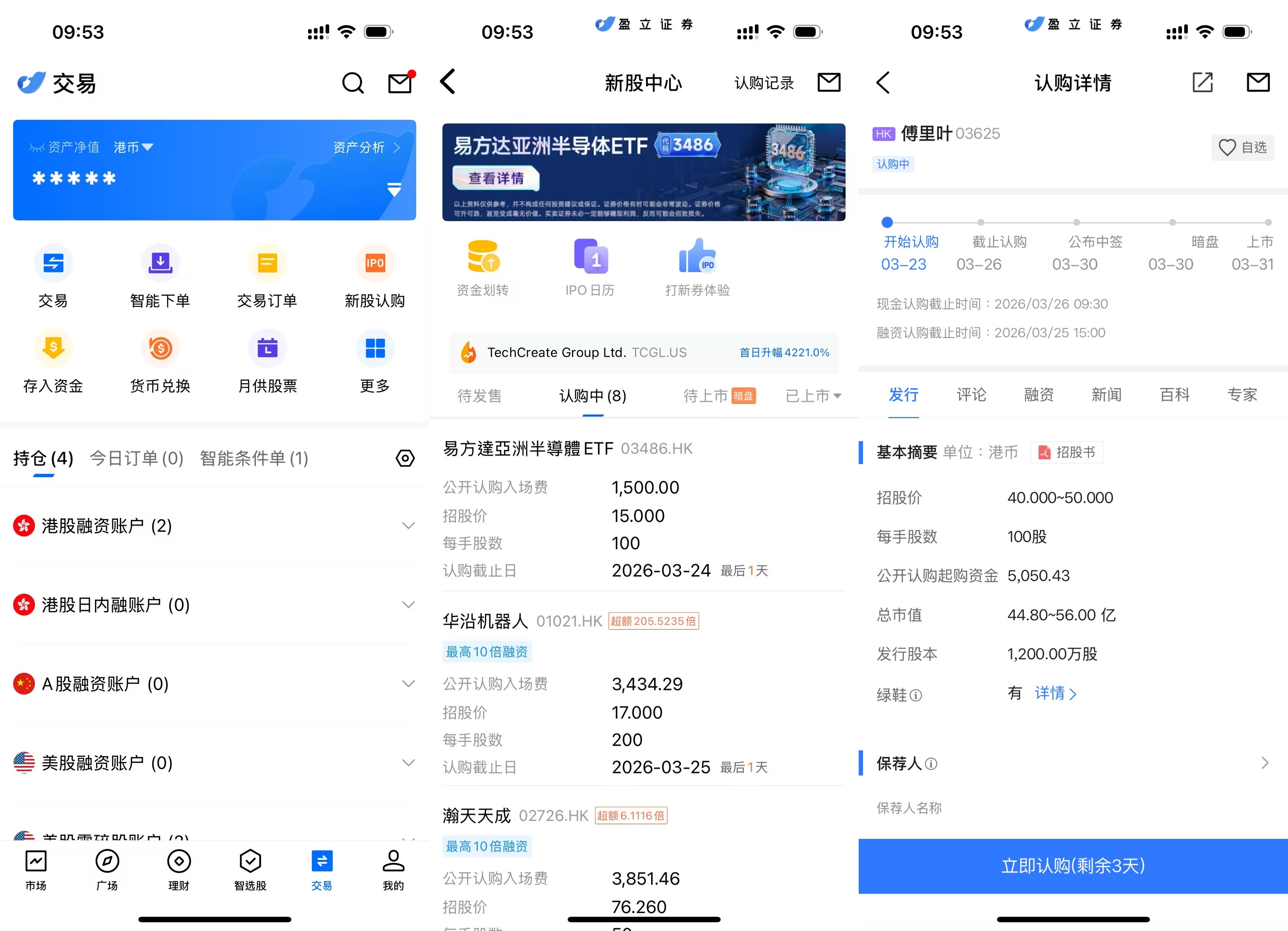 uSMART HK App 设有 IPO 中心,提供独家优惠,客户可在 App 即时认购公开发售之新股。登入 uSMART HK App 后,点选右下角「交易」,进入「新股认购」,选择傅里叶后点击「公开认购」,填写认购数量并提交订单即可。