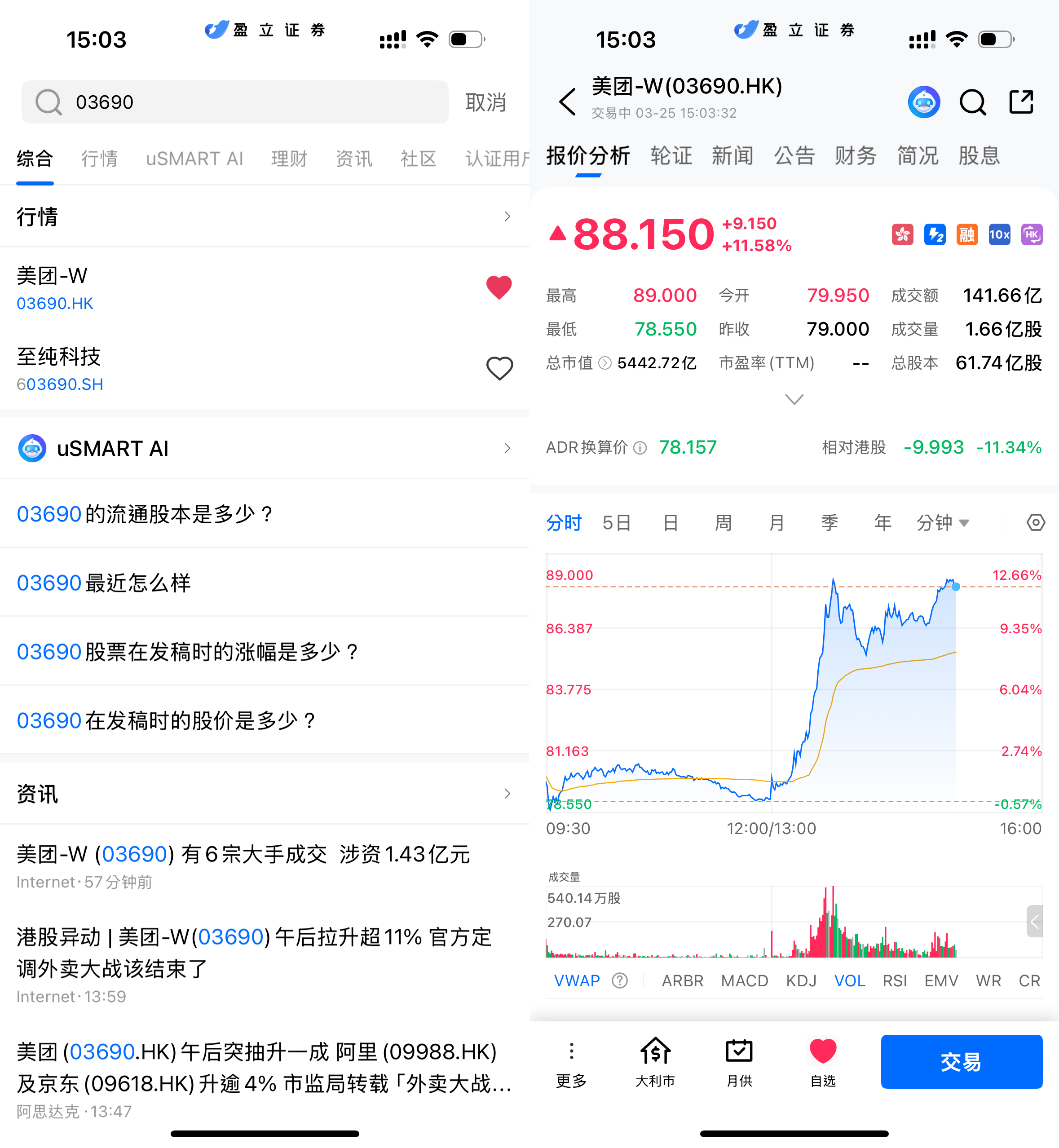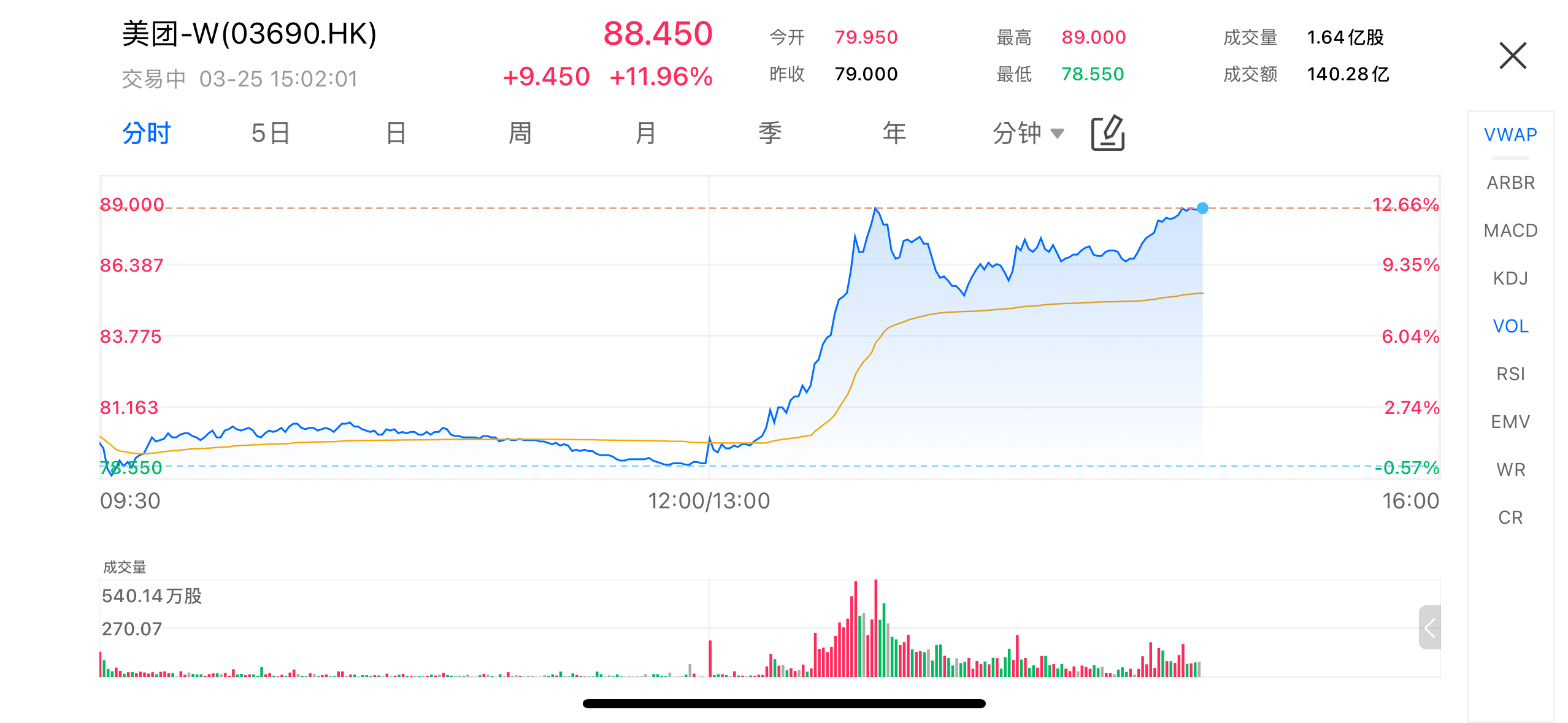 3月25日午后,港股平台经济板块突然走强,其中美团-W(03690.HK) 表现尤为亮眼。盘中股价一度拉升至11.96%,截至发稿报88.45港元,成交额达140.28亿,成为当日资金关注的焦点之一。
