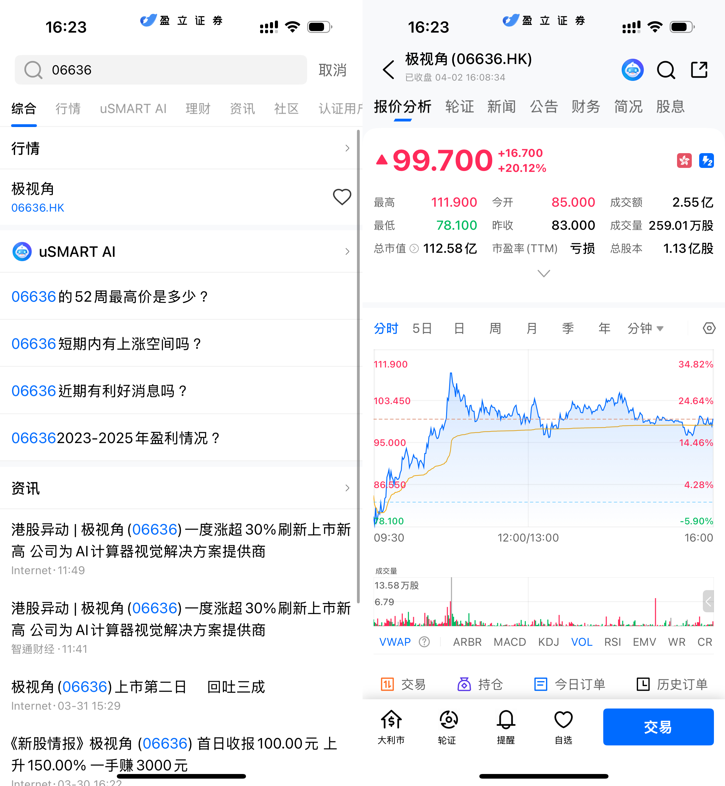 4月2日,极视角(06636.HK)收涨20.12%报99.7港元,盘中一度冲高至111.9港元,较招股以来低点显著反弹。在整体市场表现偏弱的背景下,公司股价逆市走强,上市短短四个交易日累计涨幅已接近170%,资金关注度持续提升。