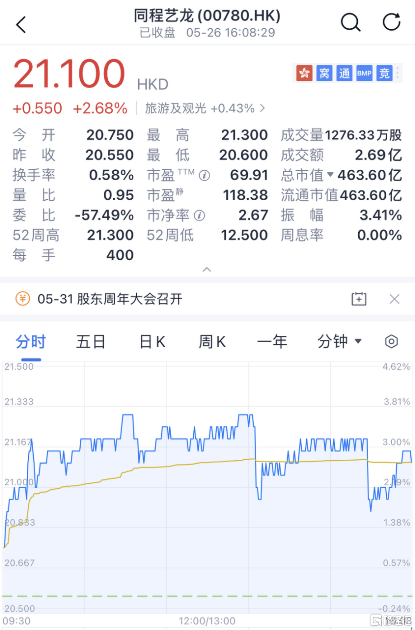 5月26日,同程艺龙股价盘中最高涨至21.3港元/股,创下了上市以来的股价新高。截至当日收盘,同程艺龙股价报收于21.10港元,较上一个交易日涨2.68%,与年初首个交易日相比累计涨幅超过40.85%,目前总市值约463亿港元。