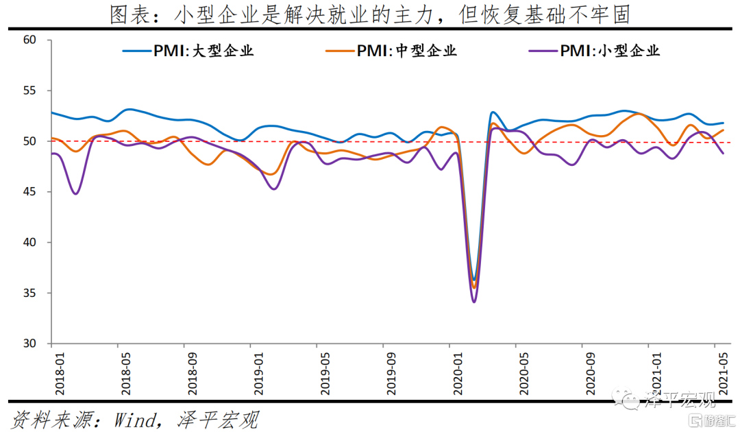 小型企业是解决就业的主力,但恢复基础不牢固。制造业从业人员指数为48.9%,较上月下滑0.7个百分点,仍在收缩区间。