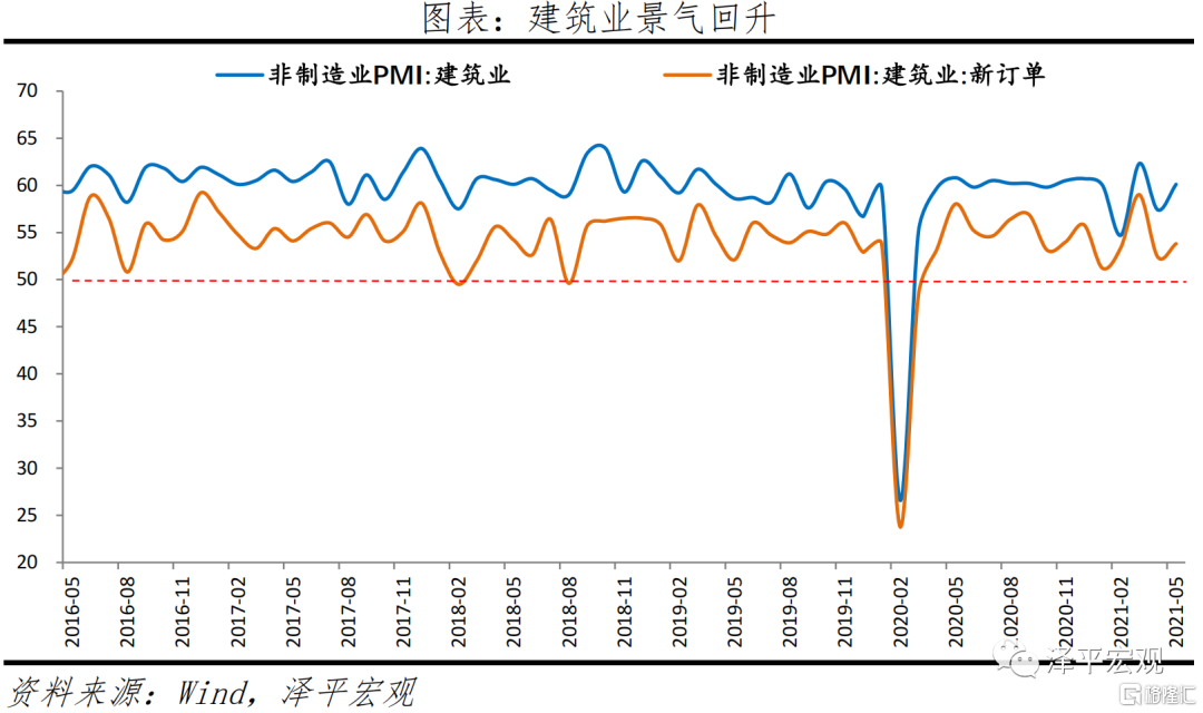 建筑业商务活动指数为60.1%,高于上月2.7个百分点,重回高景气区间。从市场需求和劳动力需求看,建筑业新订单指数和从业人员指数分别为53.8%和53.0%,高于上月1.4和2.0个百分点;从预期看,业务活动预期指数65.7%,较上月上升0.9个百分点。
