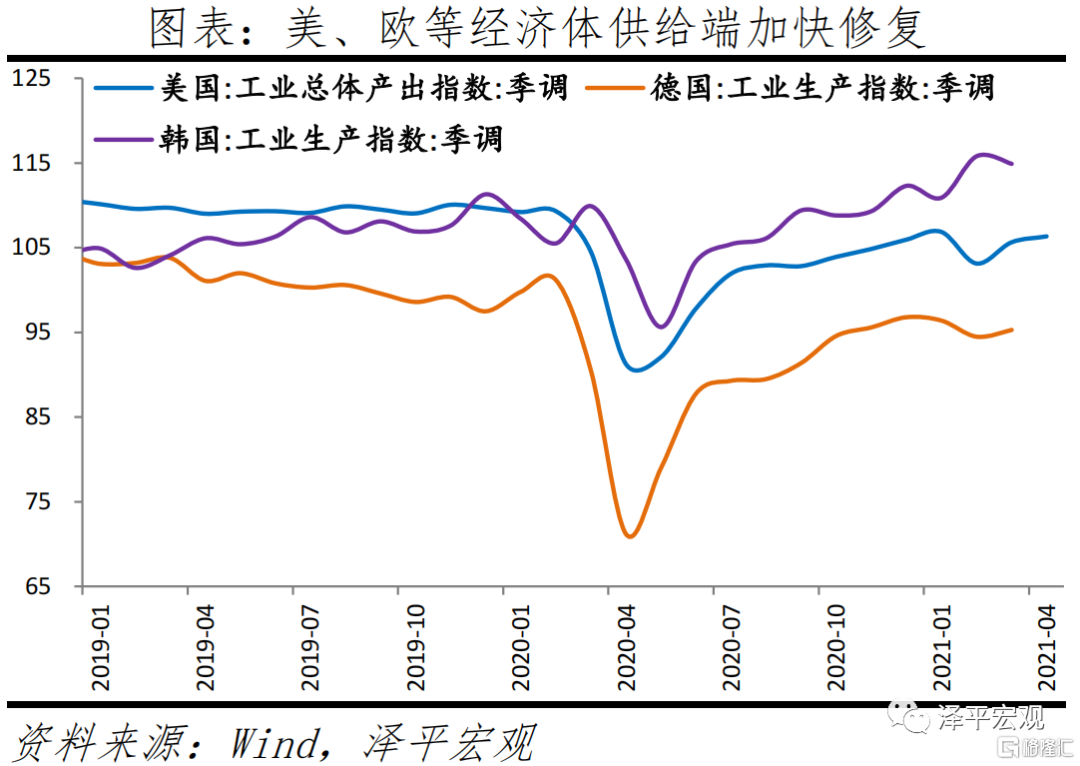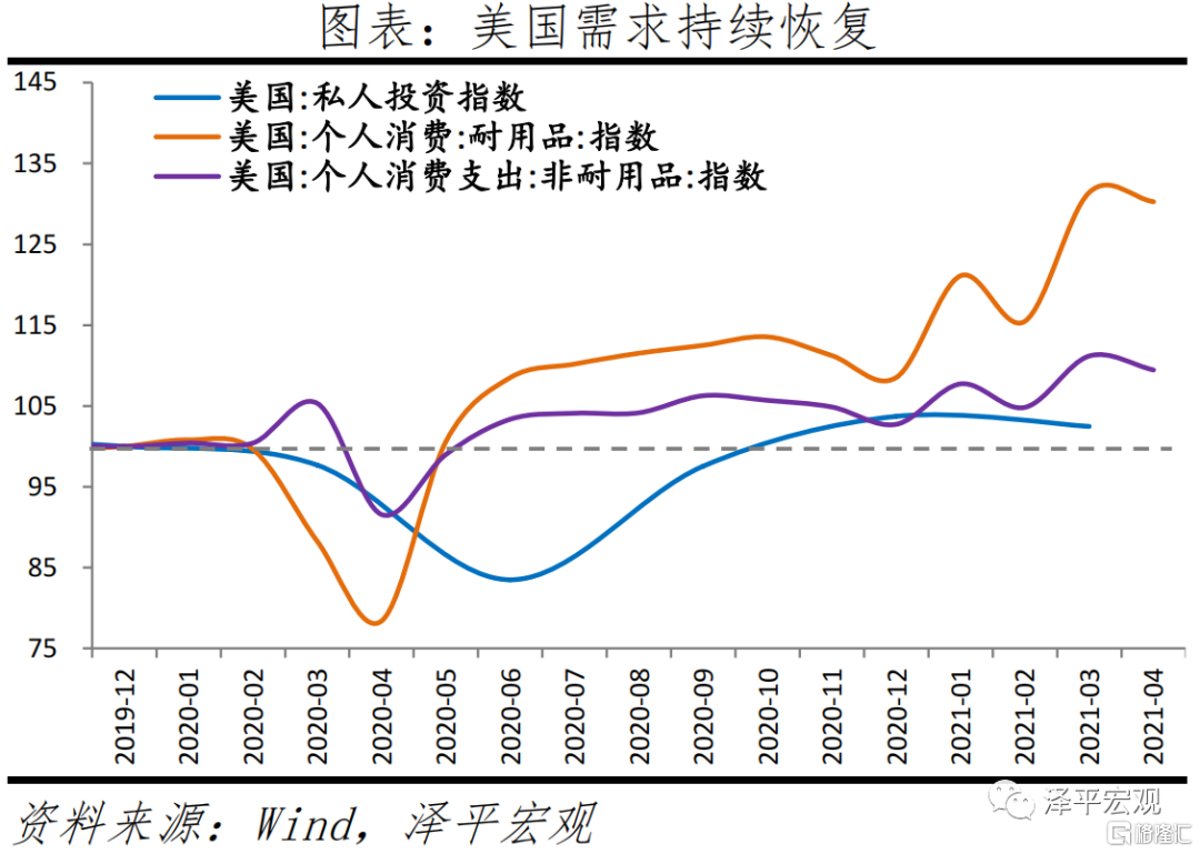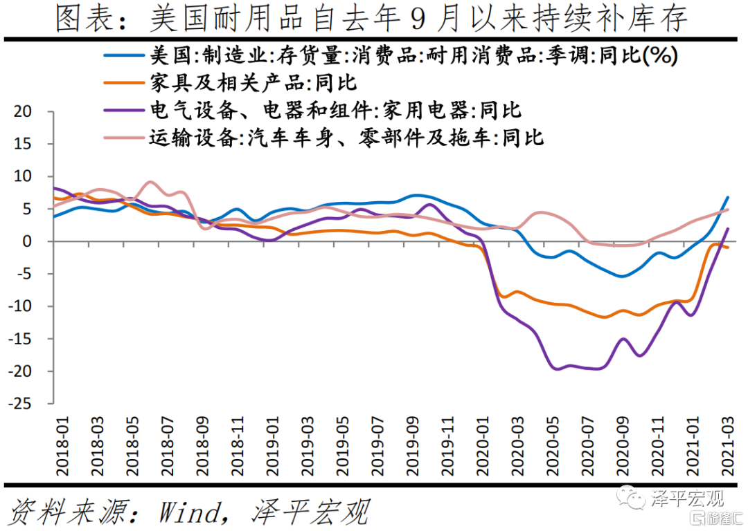 美国供需缺口逐渐收窄,耐用品库存持续上升。受益于拜登1.9万亿美元刺激计划,需求加快恢复,美国商品消费创新高;美国Markit制造业PMI为61.5%。供给端美国产能利用率、工业产出指数已恢复到疫情前80%水平。美国耐用消费品自2020年9月开始补库存,已恢复至2019年库存水平;从具体商品看,中国出口增速较高的产品家具、汽车和家电,美国存货均持续攀升。