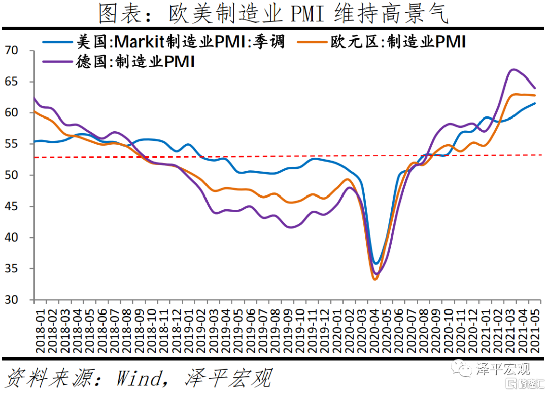新出口订单指数为48.3%,低于上月2.1个百分点,景气度重回收缩区间。4月美国工业产能利用率为74.87%,基本恢复至疫情前水平。美国Markit制造业PMI为61.5%,较上个月上升1.0个百分点;欧元区制造业PMI为62.8%,德国制造业PMI为64%。