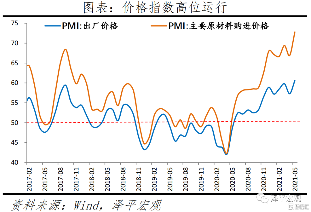 5月制造业PMI主要原材料购进价格指数和出厂价格指数分别为72.8%和60.6%,分别较上月上涨5.9和3.3个百分点,在创新高。原油价格环比上涨6.3%,南华工业品指数环比5.4%,螺纹钢环比4.7%,焦煤环比11.0%,动力煤环比13.8%,LME铜环比9.3%。