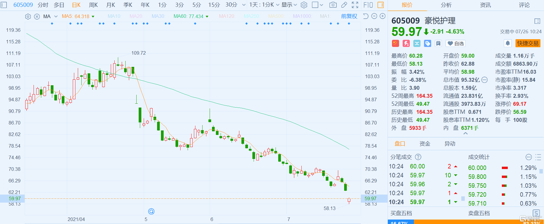 A股异动丨豪悦护理(605009.SH)跌4.63% 预计半年度净利润下降44.09%~49.42%