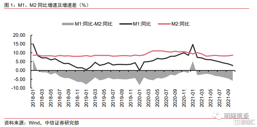 2021年11月10日,央行发布2021年10月金融数据。10月货币供应方面,M2同比增速8.7%,前值8.3%,M1同比增速2.8%,前值3.7%。M1与M2的同比增速出现明显分化的走势,M1-M2负向剪刀差进一步走阔。M1和M2一定程度上都可以反映实体经济状况和资金供需,而二者相对增速的变化对于债市利率也有一定的指引作用。本文将剖析M1-M2的内涵,梳理其与债市收益率相关性的历史,探讨其未来走势,从而为后续债市发展寻找线索与方向。
