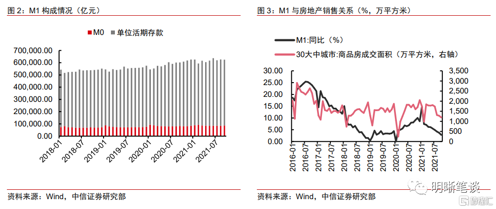 M1反映了企业的盈利预期,同时也与房地产市场的销售情况关系密切。M1包含流通中现金和单位活期存款,其中单位活期存款占据主体。M1增速提升,说明企业活期存款增速提升,意味着市场资金具有活力。经济形势向好时企业利润增加,生产投入加快使得资金周转加快、流动性需求提高,同时,由于投资机会的增加,企业投资积极性上升,更倾向于将定期存款转化为活期存款。因此,M1增速往往代表了企业基于当前形势对未来经营的判断,代表实体经济流动性的波动。此外,M1同比增速还与商品房销售情况走势接近,这是因为房地产部门的资金流量本就较高,而商品房销售会导致居民原本持有的长期存款以及银行投放的按揭贷款等资金大量流入企业账户。