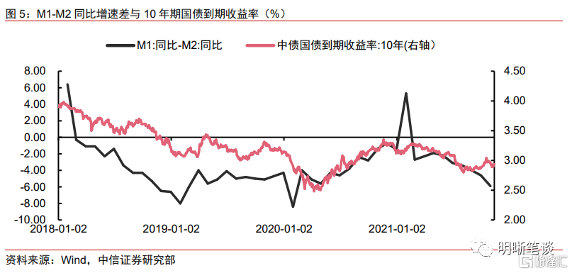 从2018年以来M1-M2的同比增速差和10年期国债到期收益率的情况来看,二者基本呈现一致的走势。总的来看是因为M1-M2与实体企业对于未来经营的乐观程度高度相关,而10年期国债收益率也明显受到经济预期的影响,于是反映在指标中便出现了较高的相关性。具体来看,2018年M1-M2持续探底,带动利率走低。这背后的原因主要是金融供给侧改革,打击资金空转,提高实体经济融资效率。而2020年政策大力支持实体经济以对冲疫情冲击,企业经营预期修复,当年5月后M1增速回升的同时利率也开启了上升通道。