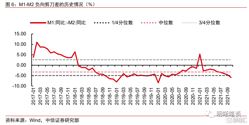 第一,目前剪刀差已处于历史较低水平,未来负向增速差进一步走阔的空间有限。我们统计了自2017年以来M1与M2同比增速差的历史走势,从下图可以看出,大多数情况下,M1同比增速不及M2,其中位数位于-3.25%处。但10月的同比增速差水平显然过低,达到了-5.9%,甚至不及历史1/4分位数(-4.95%)。因此我们认为负向剪刀差继续扩大的概率不高。