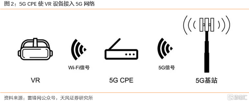 根据雷锋网观点,VR领域中最为主流的品类是VR一体机,即无需连接手机或PC,内置处理器,可以独立使用的VR产品,此类产品往往不具备直接接入5G网络的能力。为了应对这一问题,出现了5G CPE这样的设备。它可以将5G信号转化为Wi-Fi信号,现存产品就可以通过Wi-Fi连到5G CPE,再连上5G网络了。