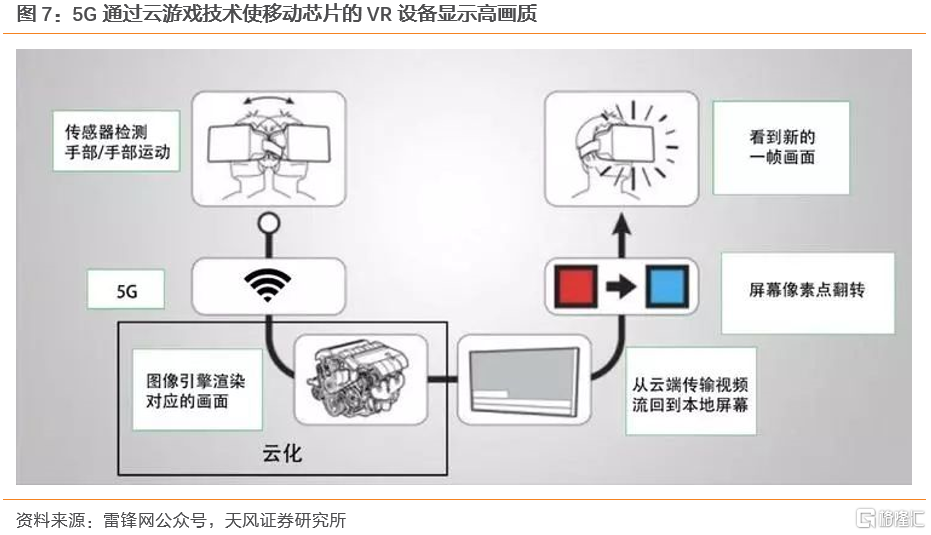 VR强调的是沉浸感,对于画质的要求很高,最极致的VR体验需要强劲的高端PC来承载。5G可以将3D图形运算放到云端,也就是云游戏的技术路线。这样就可以利用云端强劲的PC级CPU和GPU来进行3D图形运算,再以视频流的形式传回本地的VR设备上,让移动芯片的VR设备也能显示出最顶级的画质。