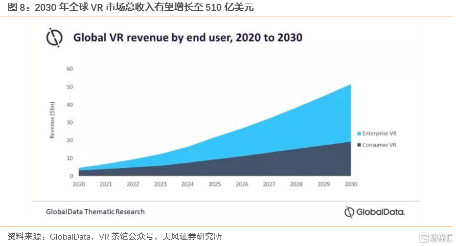 GlobalData表示VR将会是未来工作的关键技术,并且企业级元宇宙平台的开发也会进一步提高其吸引力。GlobalData预计,2020年全球VR市场的总收入大约为50亿美元,而到2030年,全球VR市场总收入有望增长至510亿美元,10年间年复合增长率达27%。