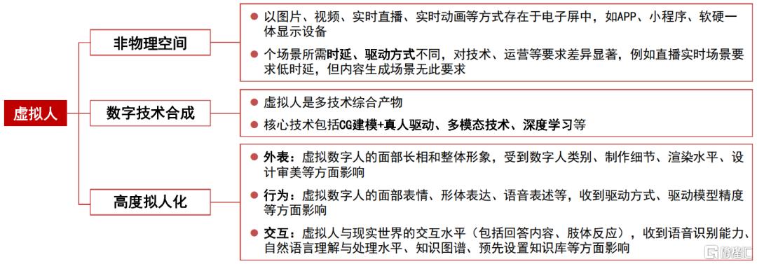 虚拟人具备存在于非物理空间、数字技术合成和高度拟人化特征。虚拟数字人指存在于非物理世界中,由计算机图形学、图形渲染、动作捕捉、深度学习、语音合成等计算机手段创造及使用,并具有多重人类特征(外貌特征、人类表演能力、人类交互能力等)的综合产物。随着AR/VR/XR等虚拟现实技术发展,虚拟人或将摆脱虚拟形象限制,映射到物理世界。